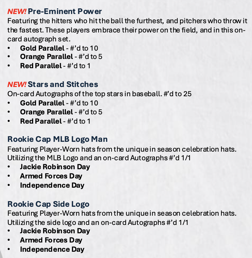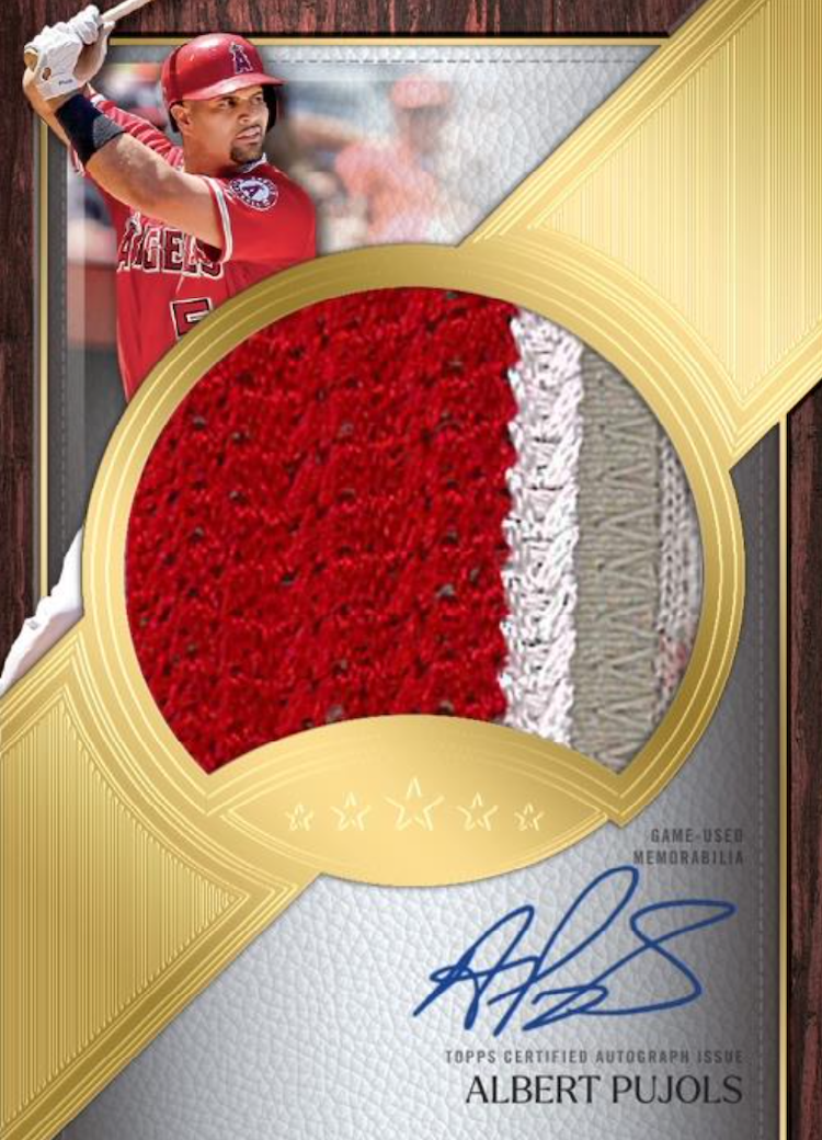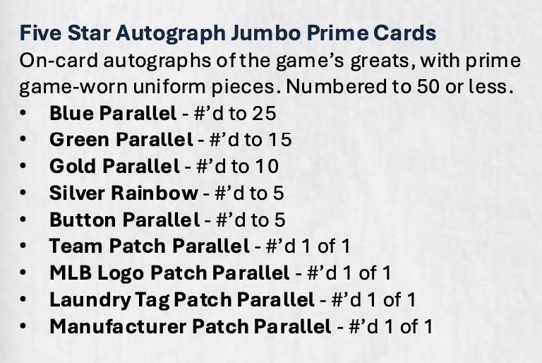Among the signed cards will be Quintuple Relics with pieces of game-used bats, gloves, batting gloves and uniforms among the possibilities. Joining them will be Award-winner Auto Relics (/10) with 1/1 image variations, Jumbo Prime (/50 max) with a meaty parallel lineup (see gallery) and duals with Orange (/5) and 1/1 Red parallels. Also in there for hits will be Pre-eminent Power, Stars & Stitches, Rookie Cap MLB Logoman cards, Rookie Cap side logos, base autos, dual autos, triple autos, Quotable, Five Tool Phenom, Five Time Signatures, Baseball Royalty, Golden Graphs, Silver Signatures, Pentamerous Penmanship, Leaping For The Stars and Field Access -- see the gallery for the full parallel lineups on all of those.