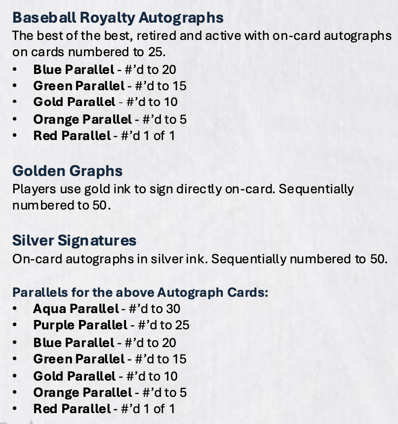 The Basics: There will be one encased card per pack here with one per box being a base card or parallel (/50 max) and then one being a case-hit auto. The other four packs will be signed cards as well. Cases will guarantee one auto Relic, one acetate auto and one colored-ink auto each time. All autos will be limited to no more than 199 serial-numbered copies. ... Base cards (/50) will have Orange (/25), Emerald (/15), Black (/10), Red (/5) and 1/1 Foilfractor parallels.