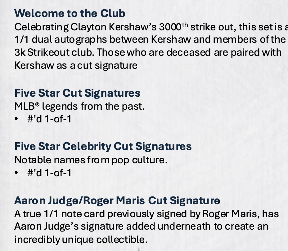 Rounding things out for the rarest of the rare all be a Roger Maris/Aaron Judge dual-auto card, Welcome To The Club Clayton Kershaw dual autos for 3,000-K Club members and two cut auto sets for former players and also selected celebrities.