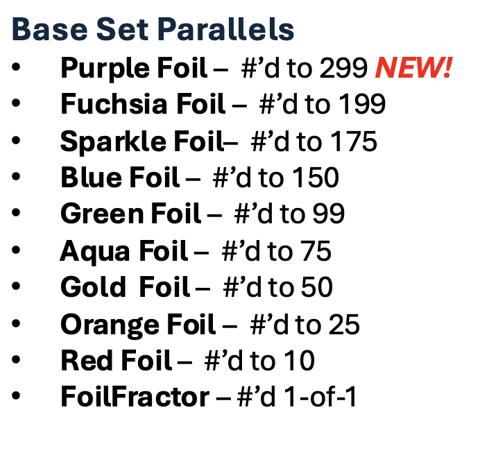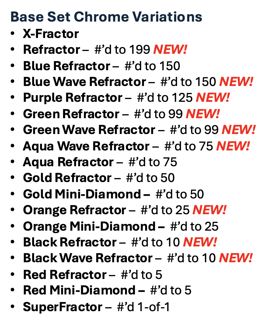The Basics: Just the initial tease is in and the base set of this one will be 200 cards. Other finds will include Chrome autos, Heritage autos for some past stars and Pro Debut jumbo auto Relics and Logoman auto Relics. Among the inserts will be Drafted, League Elites, Stars of MiLB, MiLB Legends and Ballpark Promos -- all with foil parallels. Chrome cards also will be in play with X-Fractors, Refractors, Mini-Diamonds and Superfractors among the teased inclusions there.
