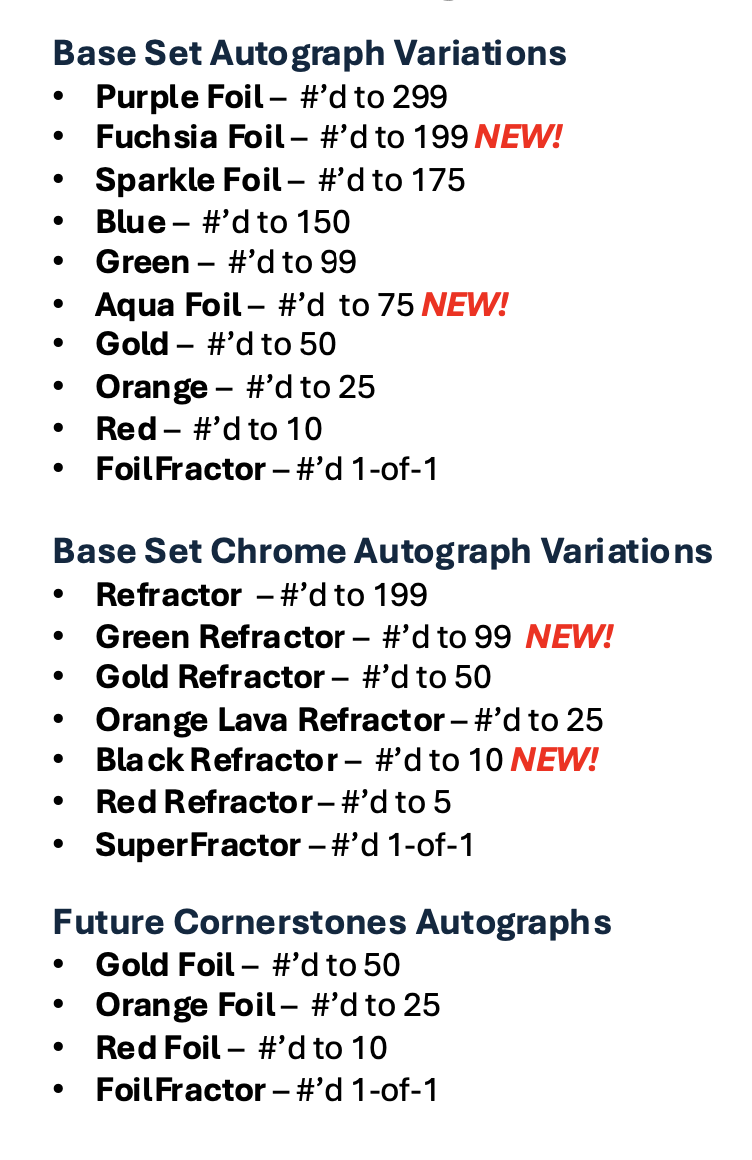 Update (Oct. 14): Parallel info has been added below. Among the inked sets will be base autos, Chrome autos, Cornerstones autos, dual autos, triple autos, jumbo auto Relics, Logoman auto Relics, MiLB Legends autos, League Elites autos and Drafted autos.
