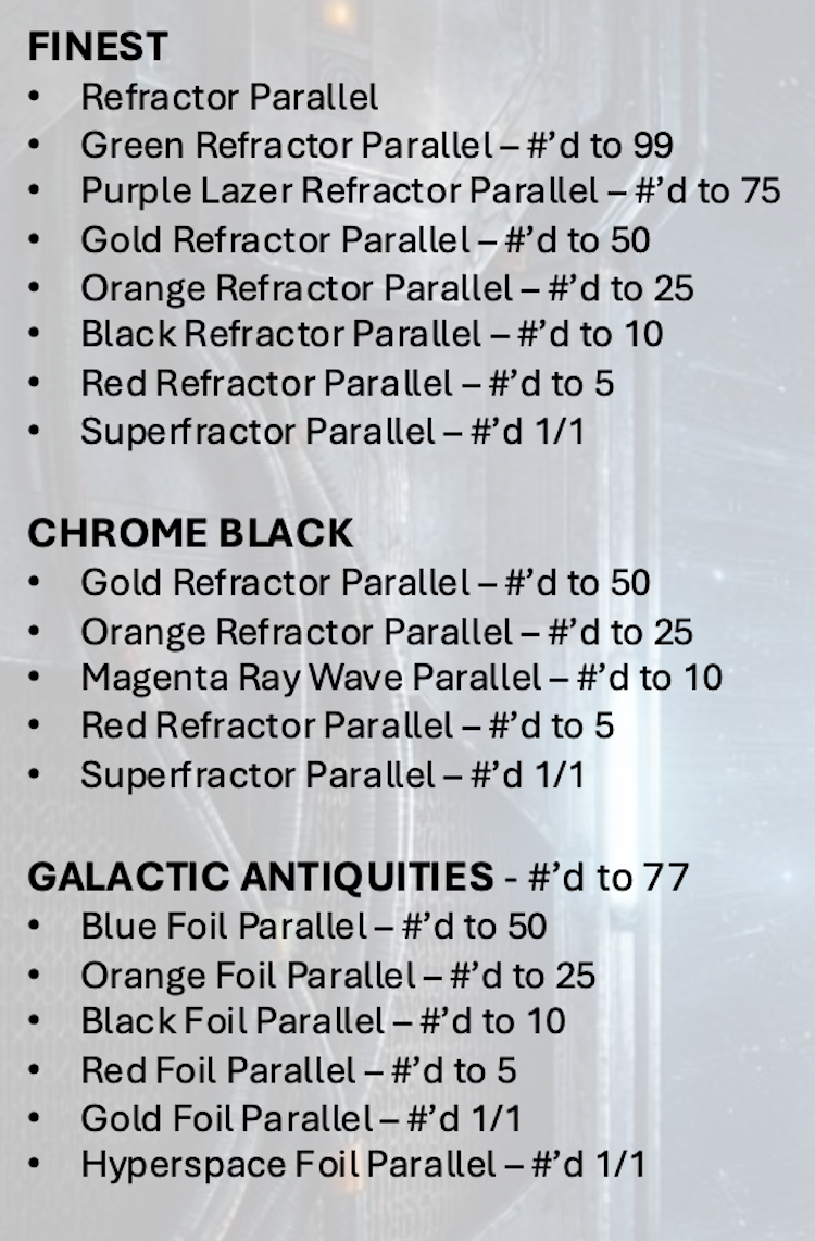 The Basics: The inserts will include a 20th Anniversary of Revenge Of The Sith set, Power Of The Force, Finest Jedi Knights, Stellar Signatures Art Reproductions, Galactic Funk, Cortosis Metal, Droid Shadowbox, Lightsaber Shadowbox and Civilized Age Art cards. ... Ink will include Chrome Black, Finest, Stellar Signatures, Cortosis Metal, Trios, Quads and a Light Side Ultimate Autograph Book that’s equaled by a Dark Side Ultimate Autograph Book. Sketchagraphs, Stellar Signature Art Cards, Triptych Sketch Cards and standard sketches (with foil parallels) are in play per the full checklist linked above. Full parallel lineups can be seen on the odds file linked above.