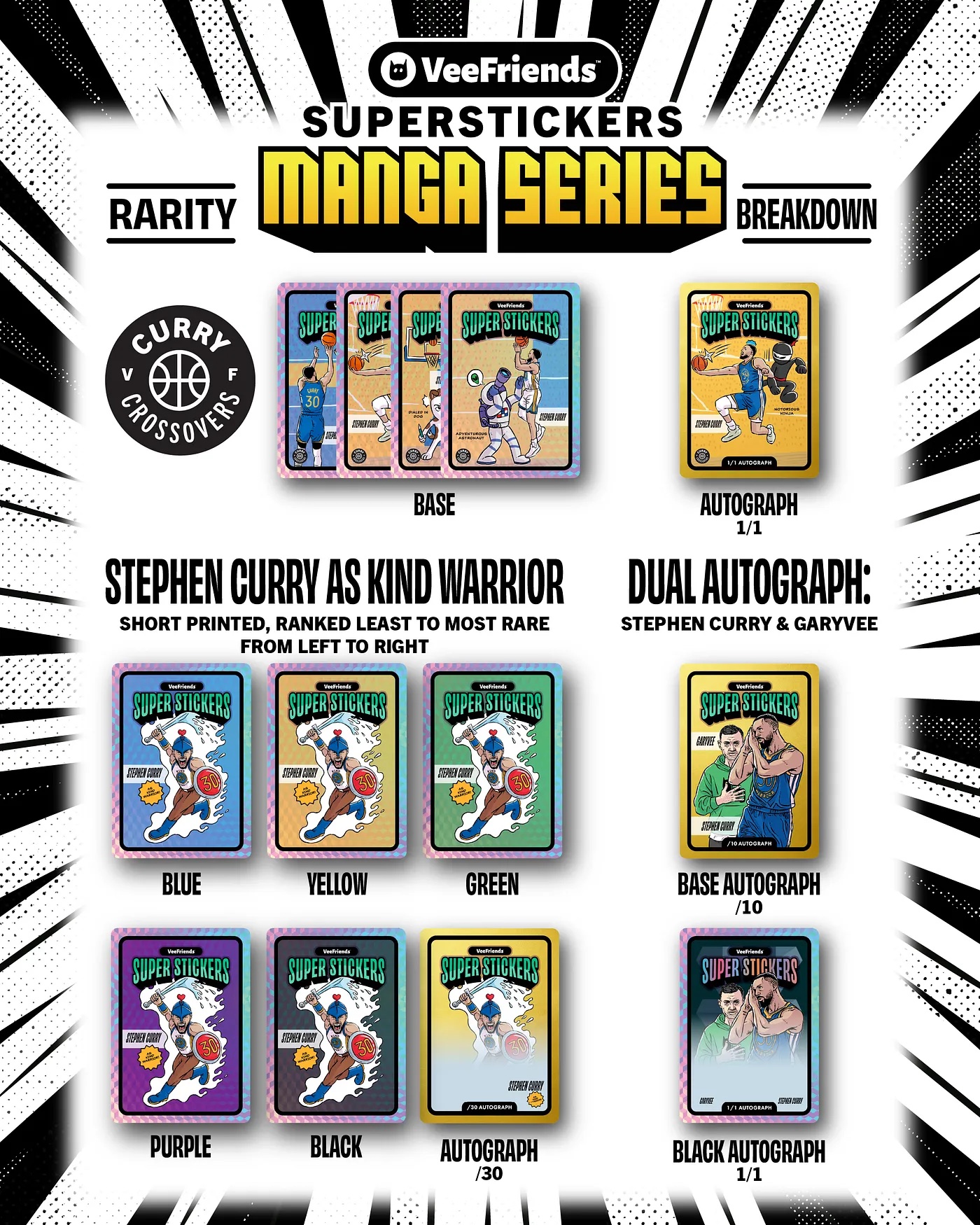 The Basics: There will be seven three-sticker packs per box with three Black & White short-printed variations, two numbered parallels and one Crossover insert inside. ... The rarer finds here are Stephen Curry as Kind Warrior, GaryVee’s debut Super Sticker, autographs for both of them and even Curry-Vee dual-autos as the ultimate chase. The lineup of parallels is pretty simple (full breakdown starting the gallery below) with eight parallels for standard stickers and five per for the Curry sets. There are 20 Curry Crossovers -- Curry vs. VeeFriends -- and five Kind Warriors there with the others in this one showcasing VeeFriends characters. ... There also will be autographed versions for these sets with /30 for Curry, 1/1 for Vee ink on VeeFriends characters and then the duals (/10) with a 1/1 ultimate chase there. ... The project features art from LuckyMong, "a globally renowned manga artist whose kinetic linework and deep ties to sneaker and basketball culture capture Curry’s warrior spirit both on and off the court," according to a company release.