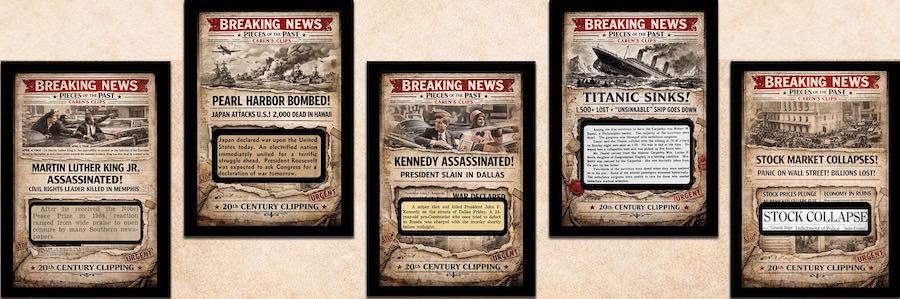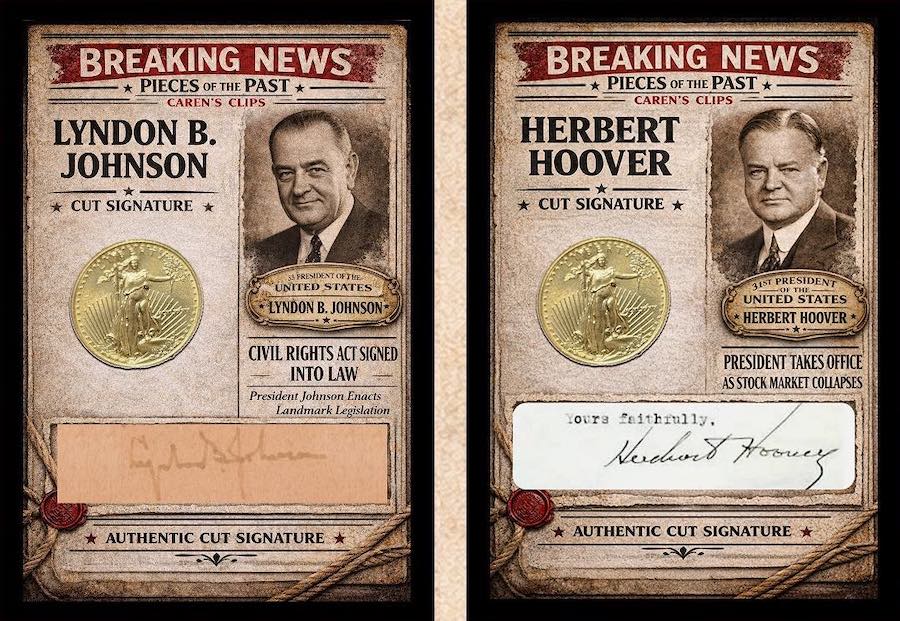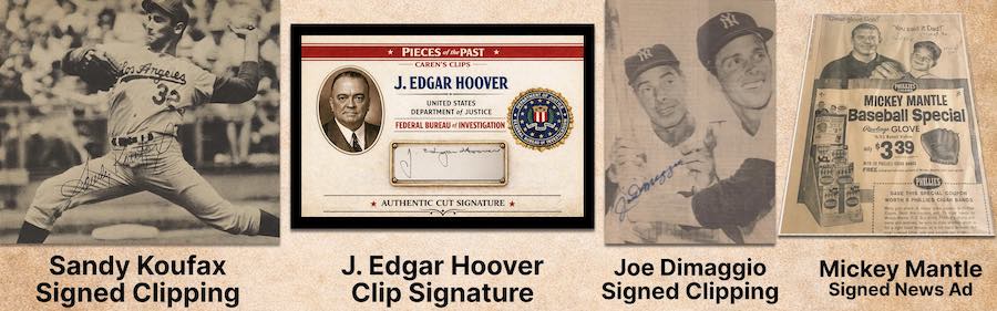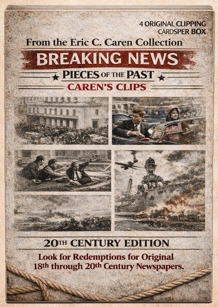 The Basics: Beyond the cards, there will be redemptions for complete newspapers from the 1700s, 1800s, 1900s and then for specific subjects such as Abraham Lincoln and the Titanic. There also will be redemptions for signed clippings and they will be found alongside cut autos with some of the subjects there being Mickey Mantle, Sandy Koufax, Joe DiMaggio, Gerald Ford, J. Edgar Hoover, Jimmy Carter, Herbert Hoover and Lyndon B. Johnson. Some cuts also will include embedded gold coins. ... Among the 50-plus subjects on news clipping cards will be John F. Kennedy, Martin Luther King Jr., the Great Depression, the Titanic, the stock market crash, Pearl Harbor, World War II, Amelia Earhart, Princess Diana, Apollo 11, Neil Armstrong and other headliners from the past. ... Boxes carry a suggested retail price of $49.95.