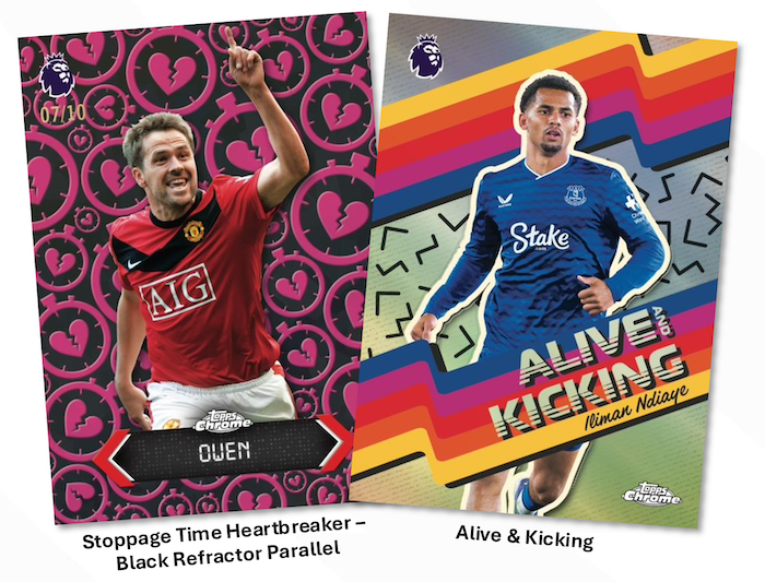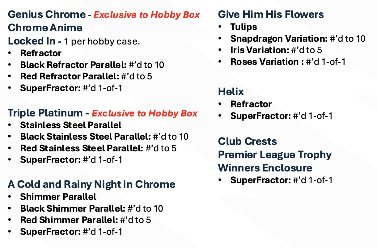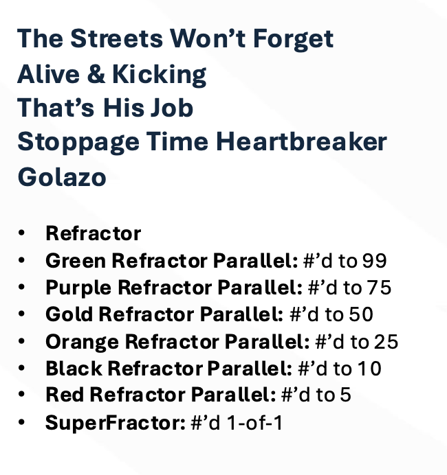 Among the insert sets will be Golazo, Stoppage Time Heartbreaker, That's His Job, Alive & Kicking and The Streets Won't Forget with their parallels below. Joining them but rarer will be Genius Chrome, Chrome Anime, Locked In, Triple Platinum, A Cold & Rainy Night, Helix, Give Him His Flowers and then three rarer Supers for Club Crests, Premier League Trophy and Winners Enclosure.