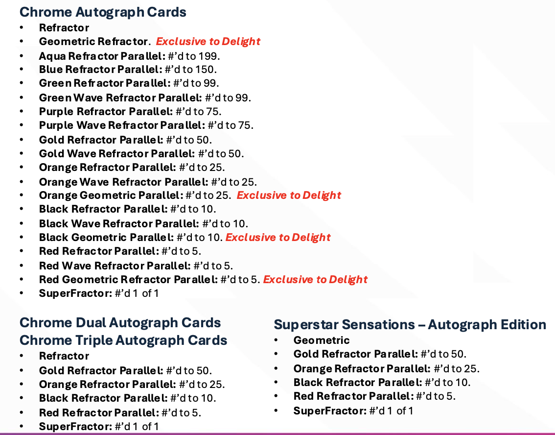 Box basics: One autograph per 18-pack box (12 boxes per case) or two autos per every Delight box (six boxes per case)