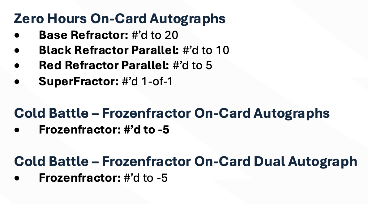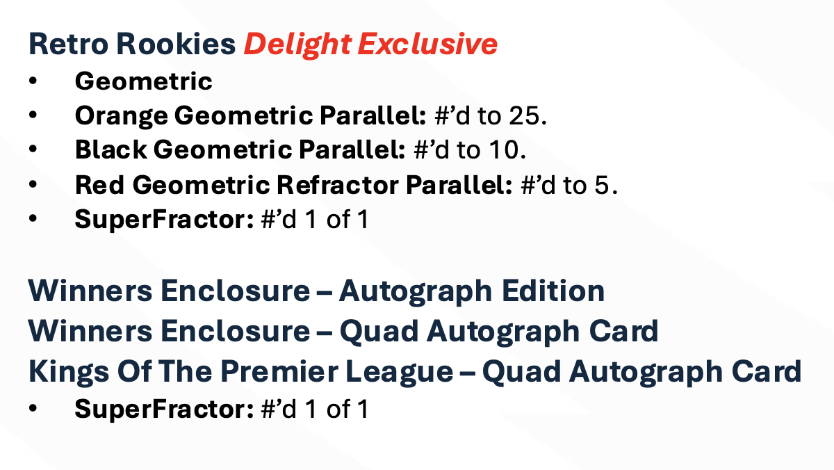 Autographs will be found for standard solo cards, duals, triples, Superstar Sensations, Retro Rookies, Winners Enclosure, Kings Of The Premier League, Zero Hours and Cold Battle with full parallel details seen below.