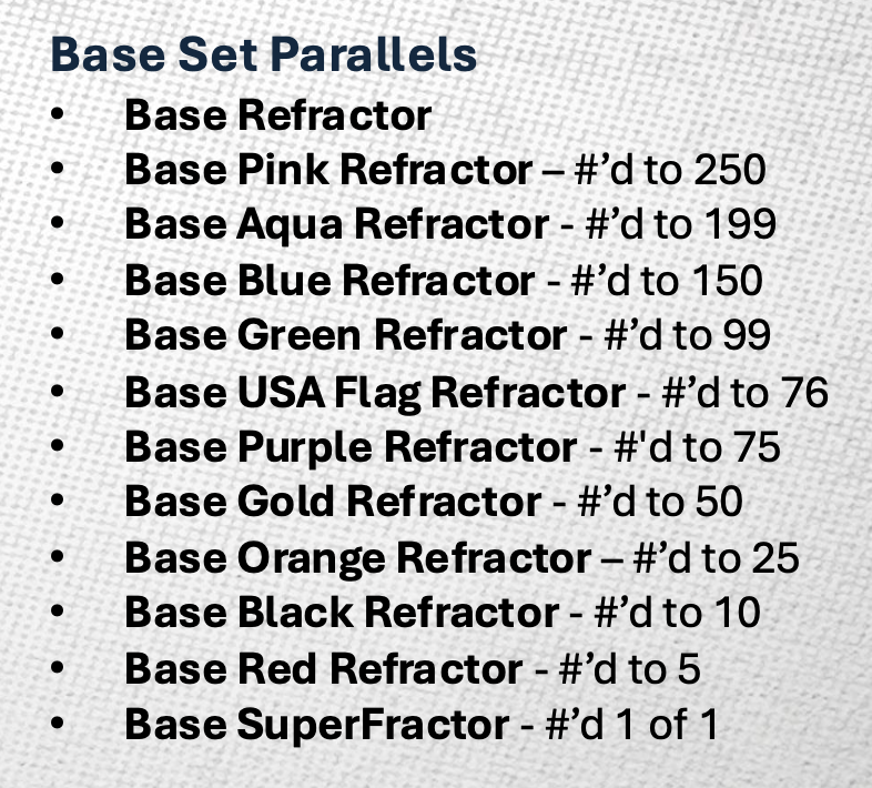 The Basics: Full details are not yet available, but this one will include a 200-card base set with plenty of parallel Refractor power that will include Supers, USA Flag, Orange, Gold and Black for starters in hobby boxes. Blasters will include Red White & Blue Refractors. Teased autographs carry a nod to the 1986 Topps NFL design, while Helix inserts were also teased with past and present stars in the overall lineup.