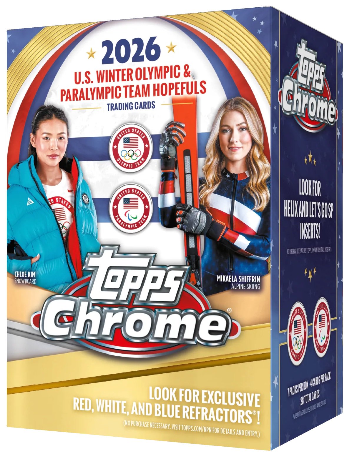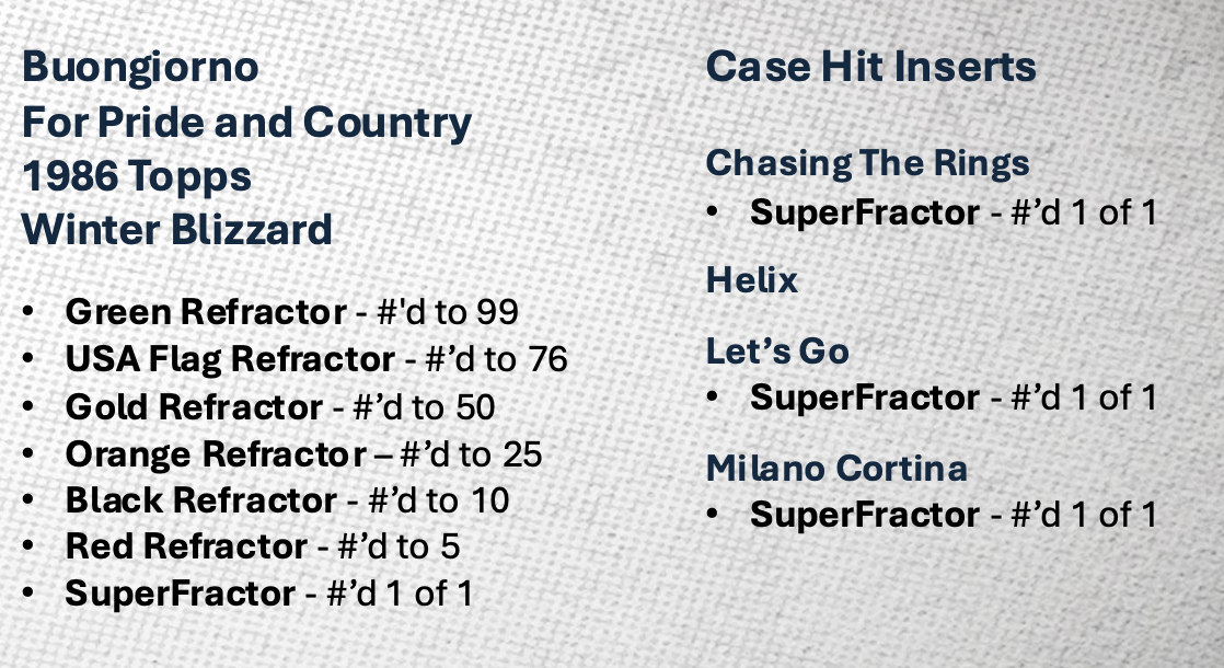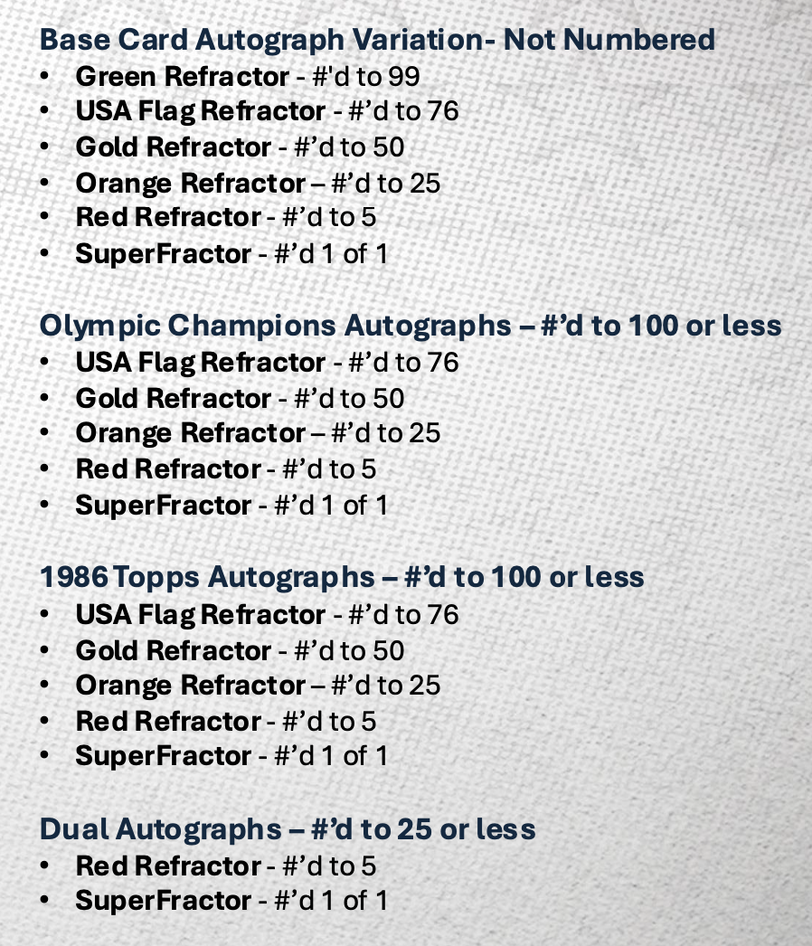 Update: Each hobby box will include Refractor Parallels, four serial-numbered parallels and four other inserts. A case will include one Olympic Champions auto, one Chasing the Rings card and one from the lineup of Let's Go, Hidden Gems, Helix, or Milano Cortina. Full parallel details across all sets have been added to the gallery below. ... For blaster boxes, autos will be found one in every eight boxes and each box will include two Red White & Blue Refractors, two other Refractors and three other inserts.