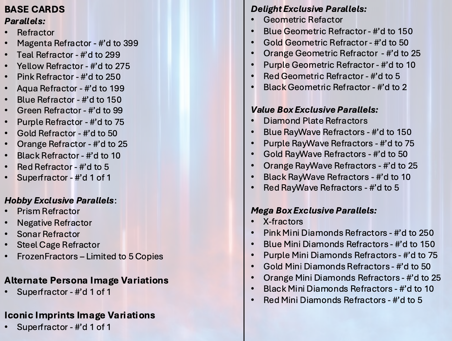 Update (March 17): Hobby boxes will include a Refractor and one insert per eight-card pack. Beyond those 12 times apiece per box along with the autos, there will be four serial-numbered inserts. There will be one case hit and two House of Cards inserts per case. Meanwhile, a Delight box will include 12 cards, including at least one Geometric parallel along with six serial-numbered parallels, one insert and the three (3) Autographs with at least one of those being a Geometric. Full insert and parallel lineups are in the gallery below.