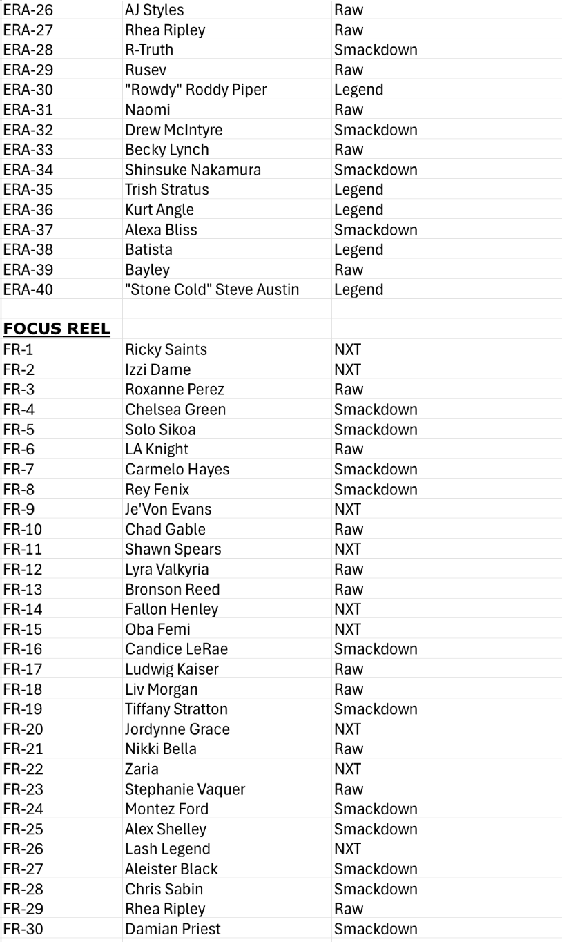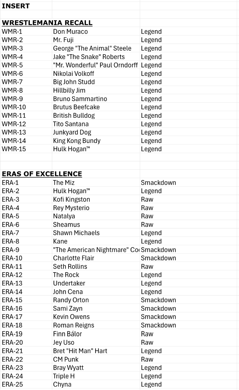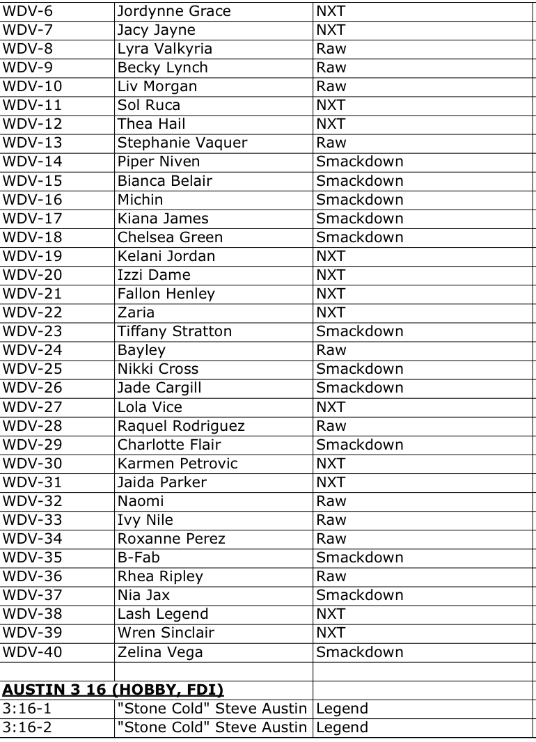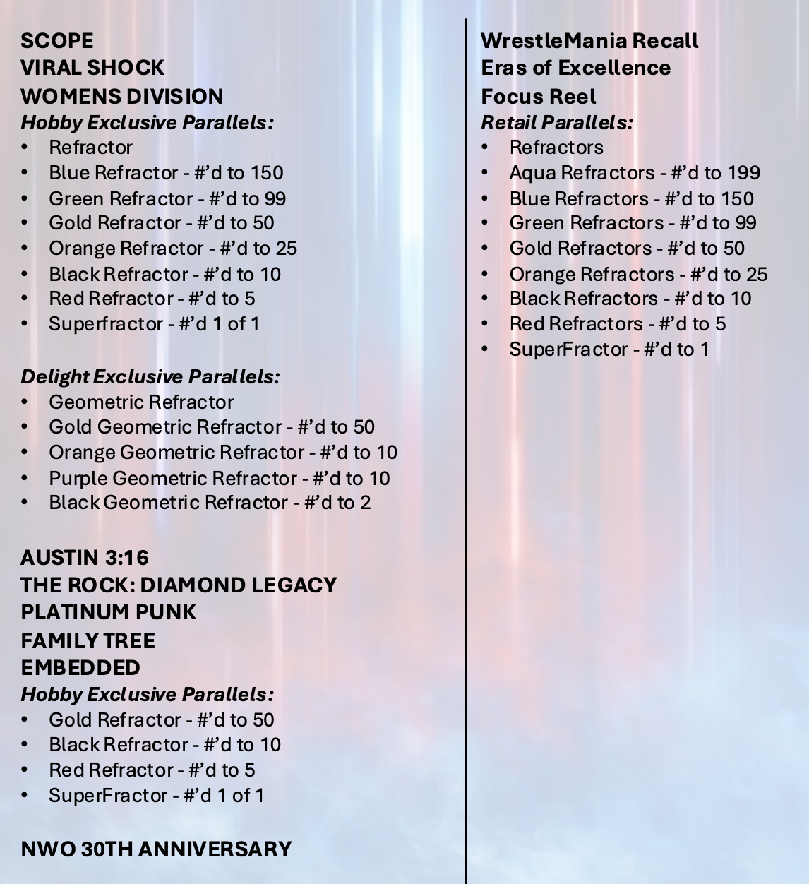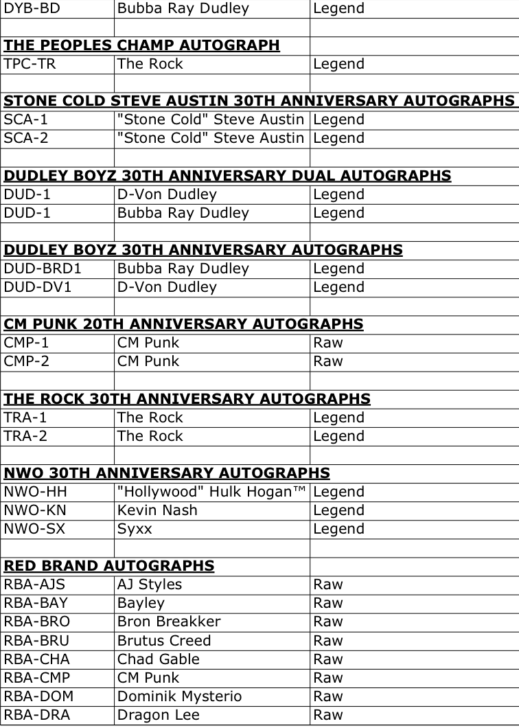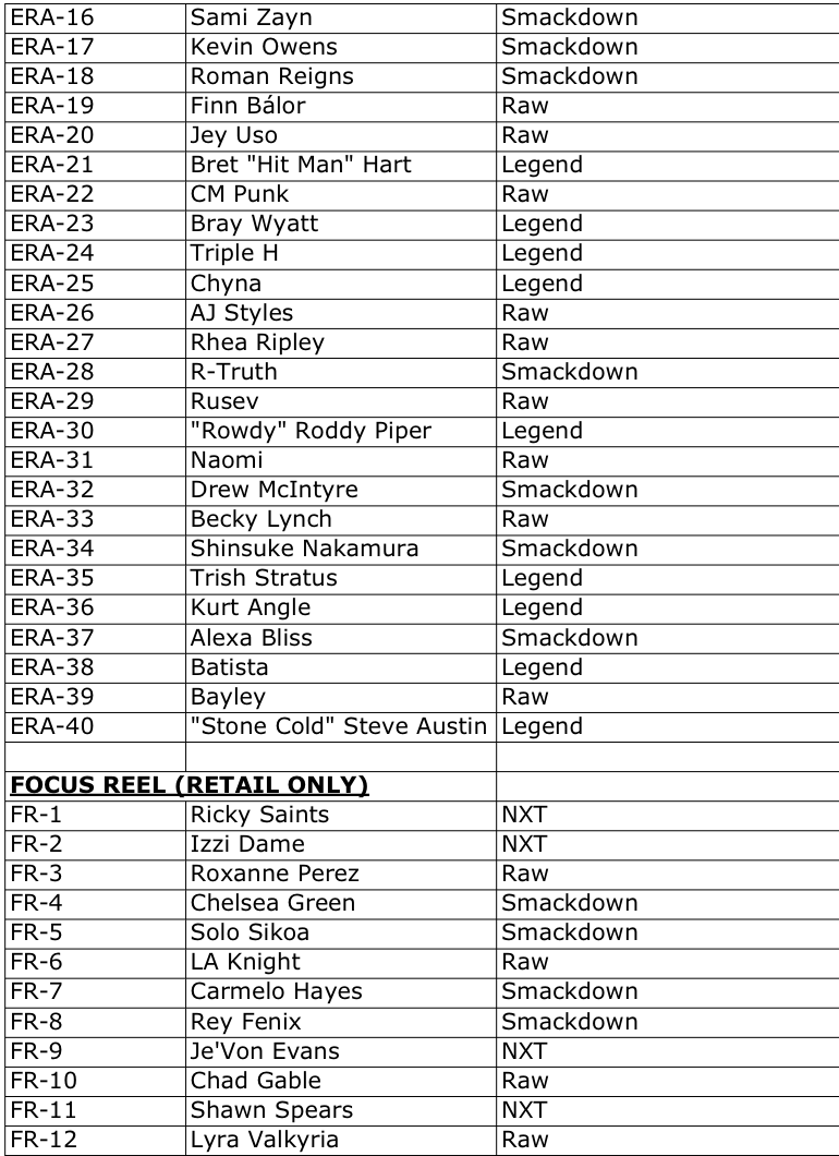 The Basics: Full info is still to come but some of the teasers include a few signed sets -- with inscriptions in the mix as well as dual-auto cards -- and insert sets that include Eras of Excellence, Gamut, Signalz, Let’s Go, Focus Reel, Feel The Pop. A trio of 30th anniversary inclusions are planned for the nWo, The Rock and “Stone Cold” Steve Austin. There will be 12 eight-card packs per hobby box. ... Mega boxes (20 per case) will include six packs of eight cards with 10 X-Fractors per box. Blaster boxes will include seven four-card packs and three Diamond Plate Refractors only found there.