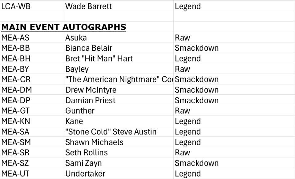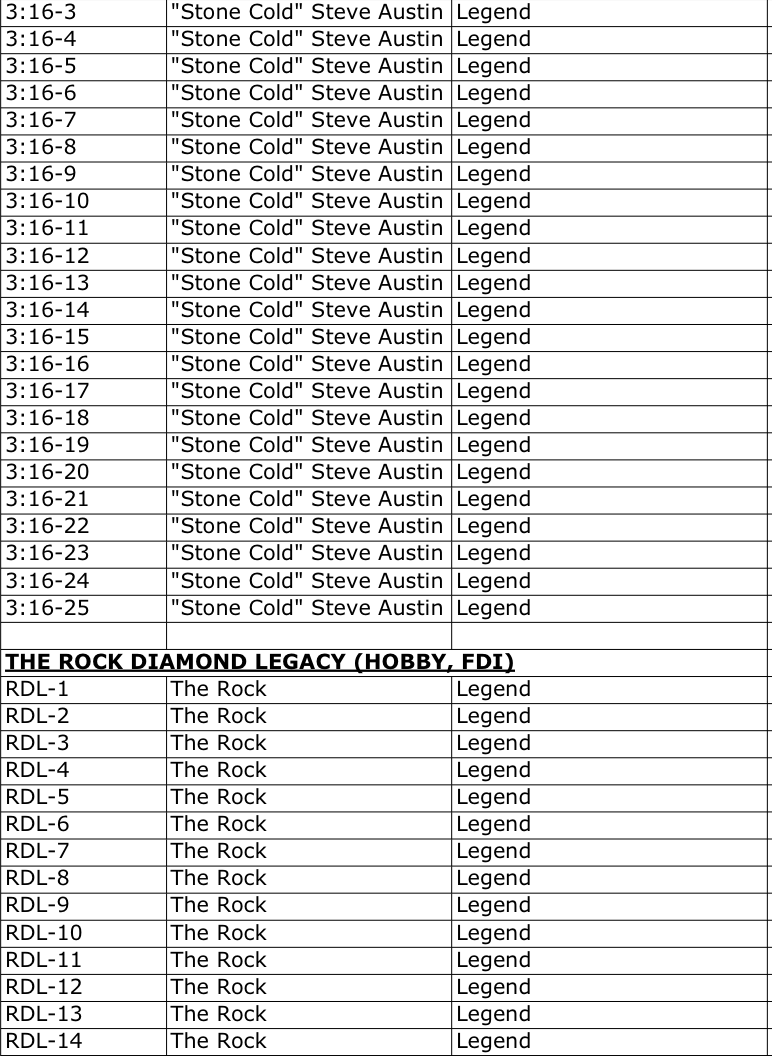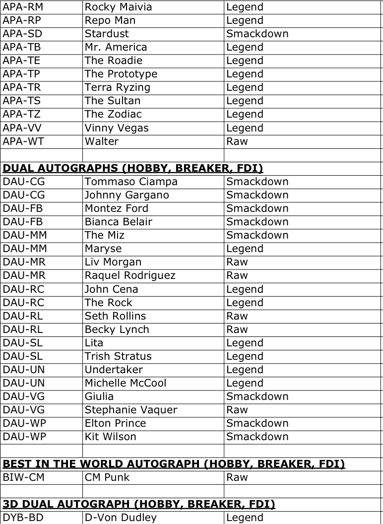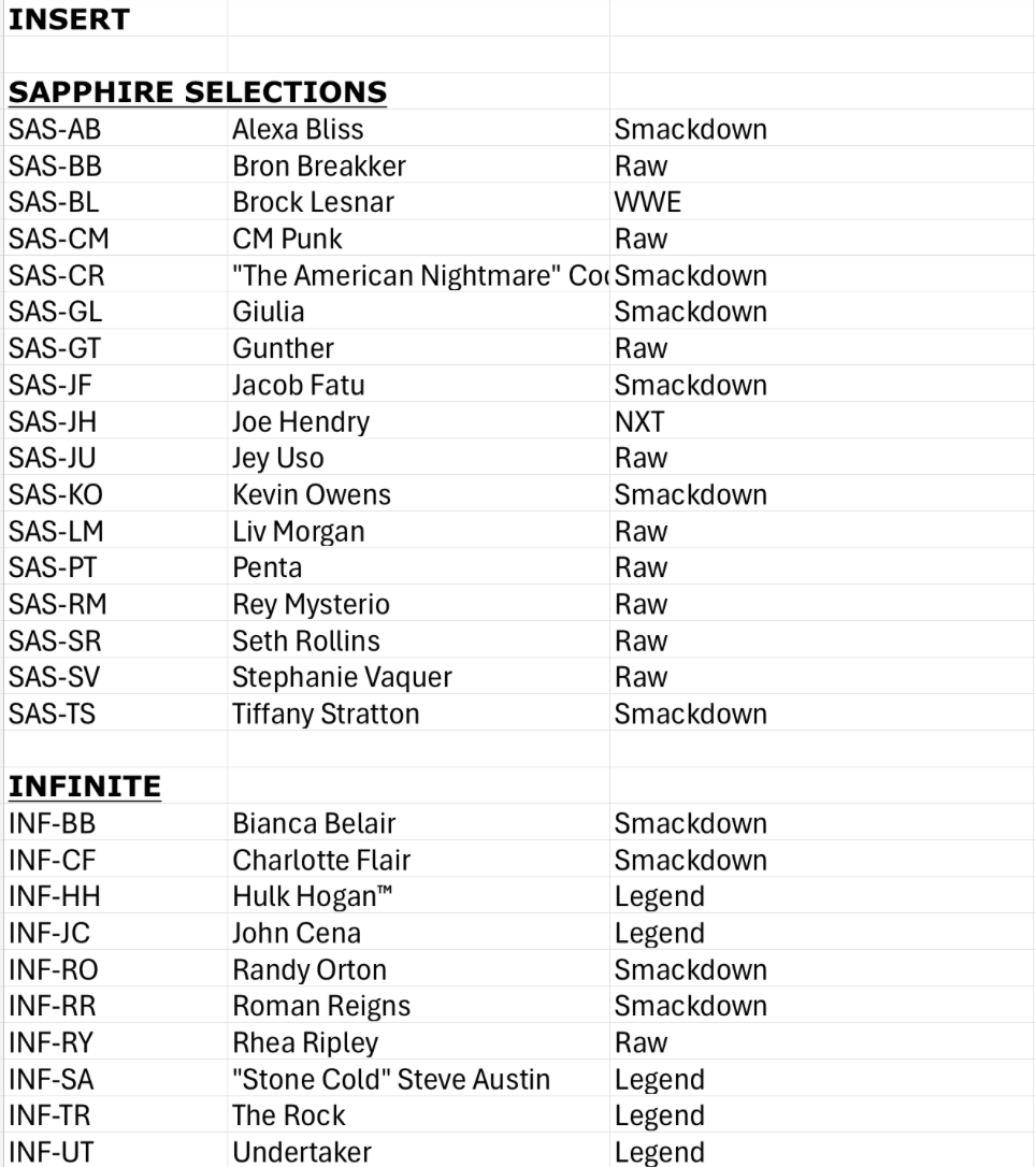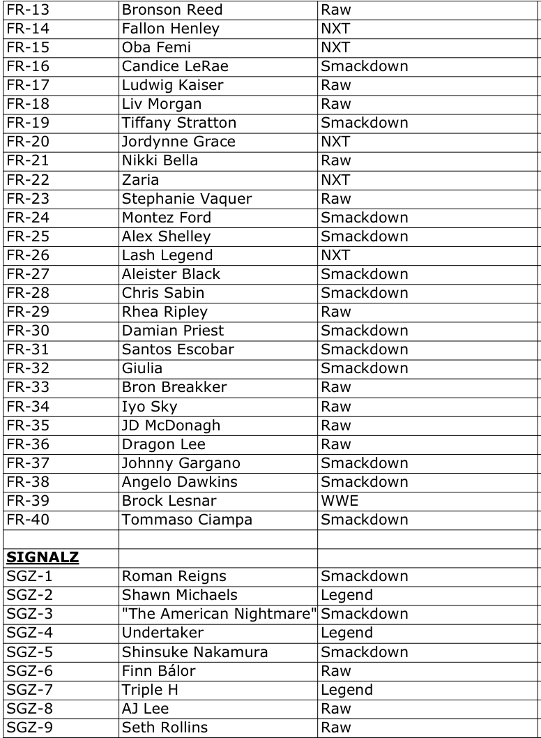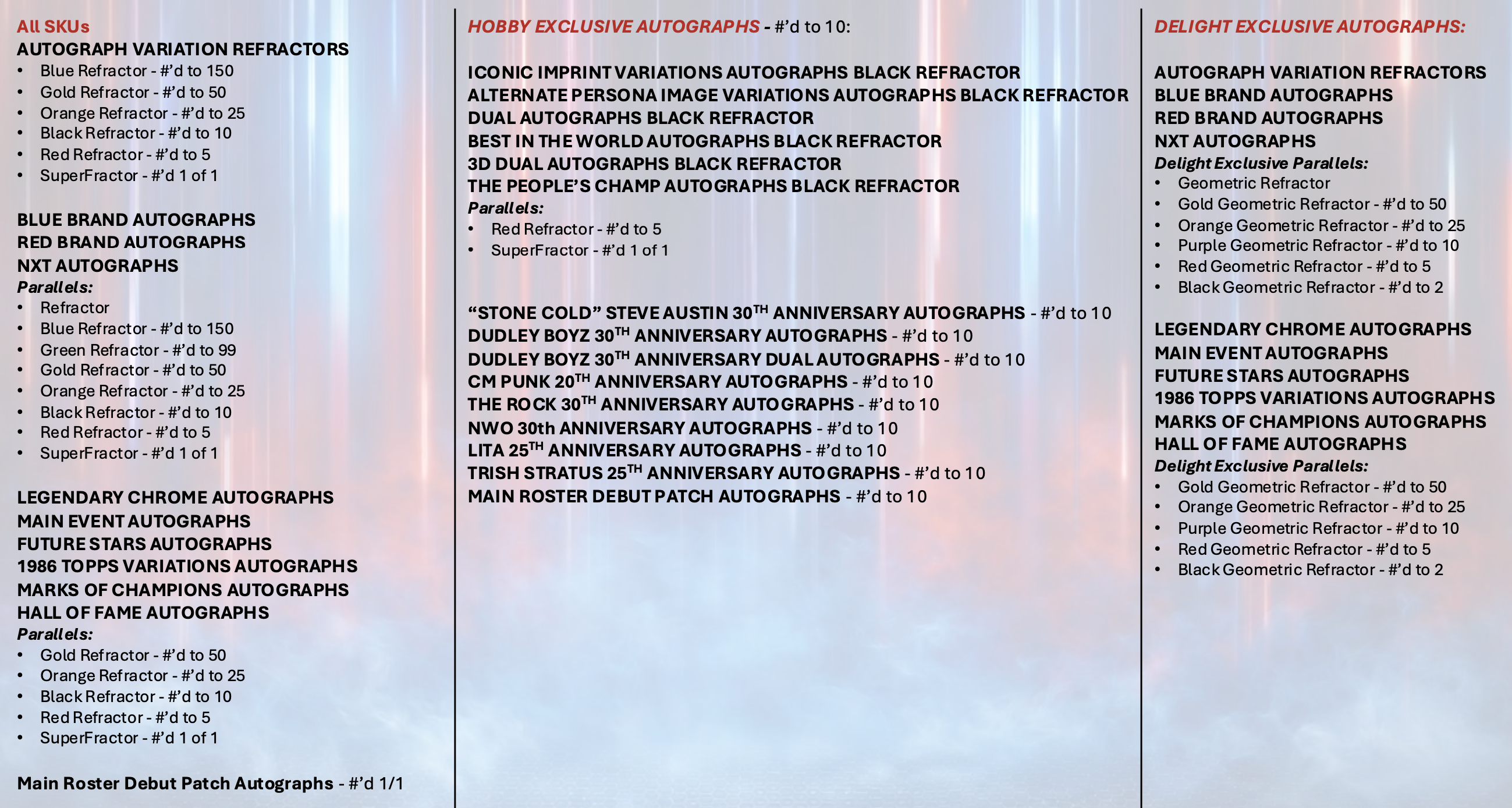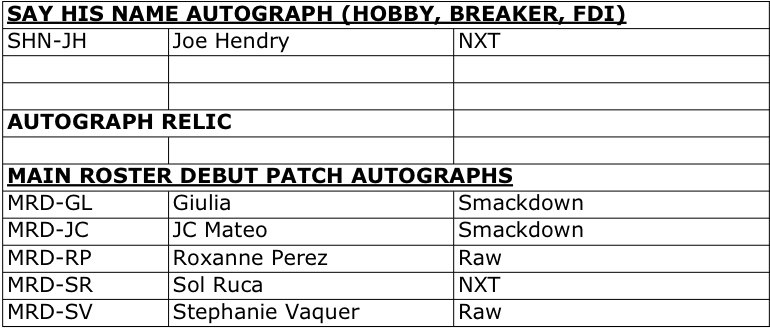 The Basics: Full info is still to come but some of the teasers include a few signed sets -- with inscriptions in the mix as well as dual-auto cards -- and insert sets that include Eras of Excellence, Gamut, Signalz, Let’s Go, Focus Reel, Feel The Pop. A trio of 30th anniversary inclusions are planned for the nWo, The Rock and “Stone Cold” Steve Austin. There will be 12 eight-card packs per hobby box. ... Mega boxes (20 per case) will include six packs of eight cards with 10 X-Fractors per box. Blaster boxes will include seven four-card packs and three Diamond Plate Refractors only found there.