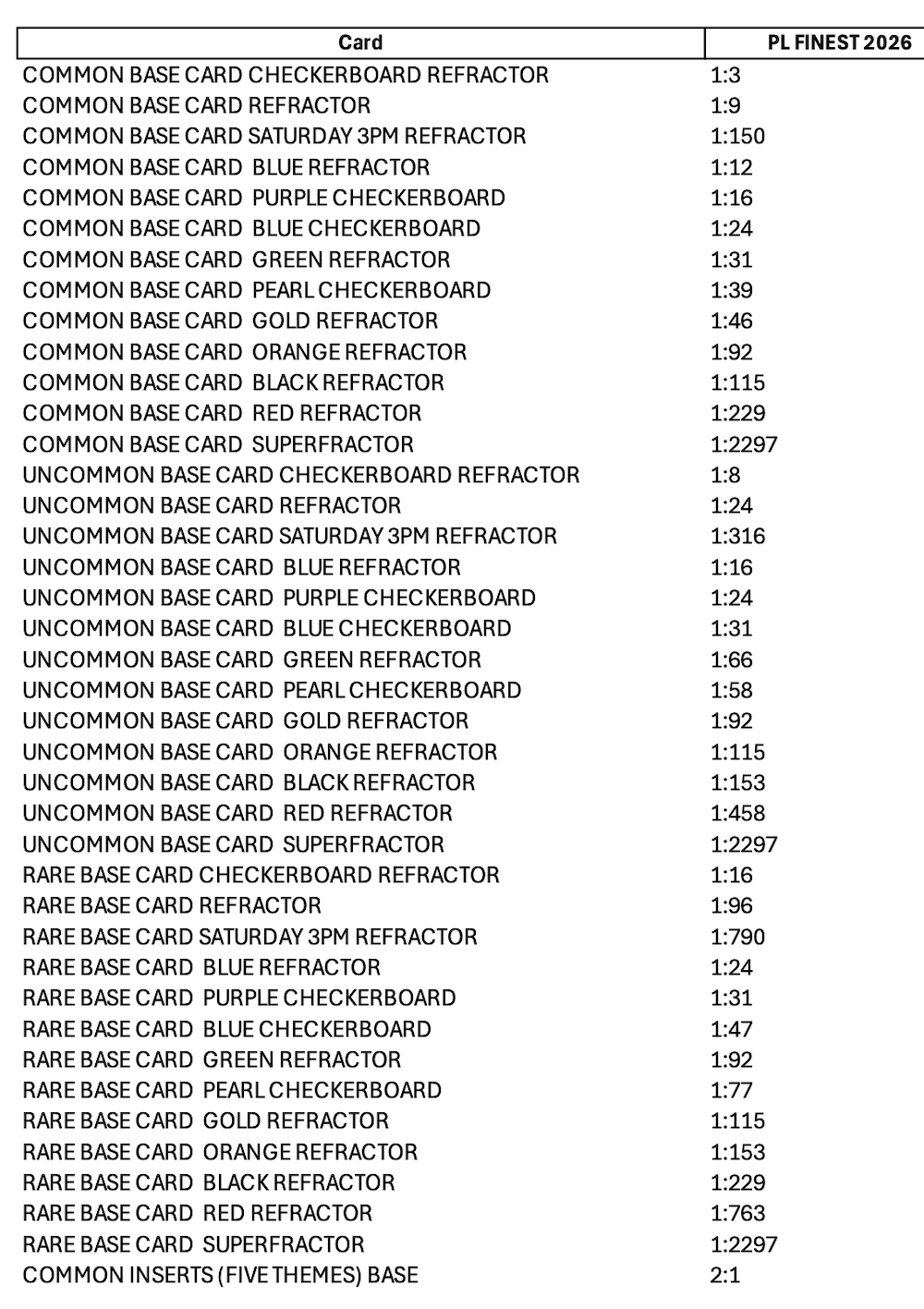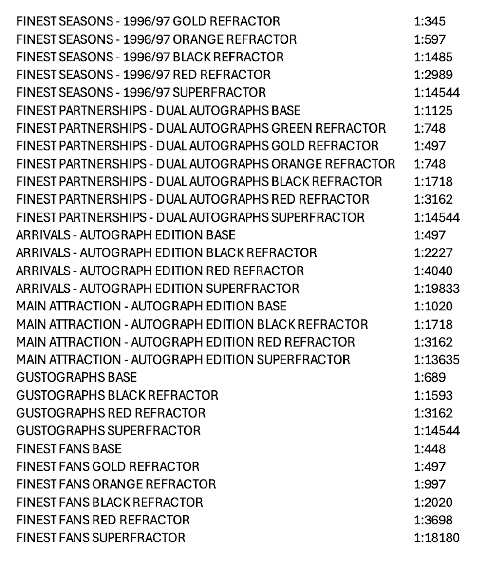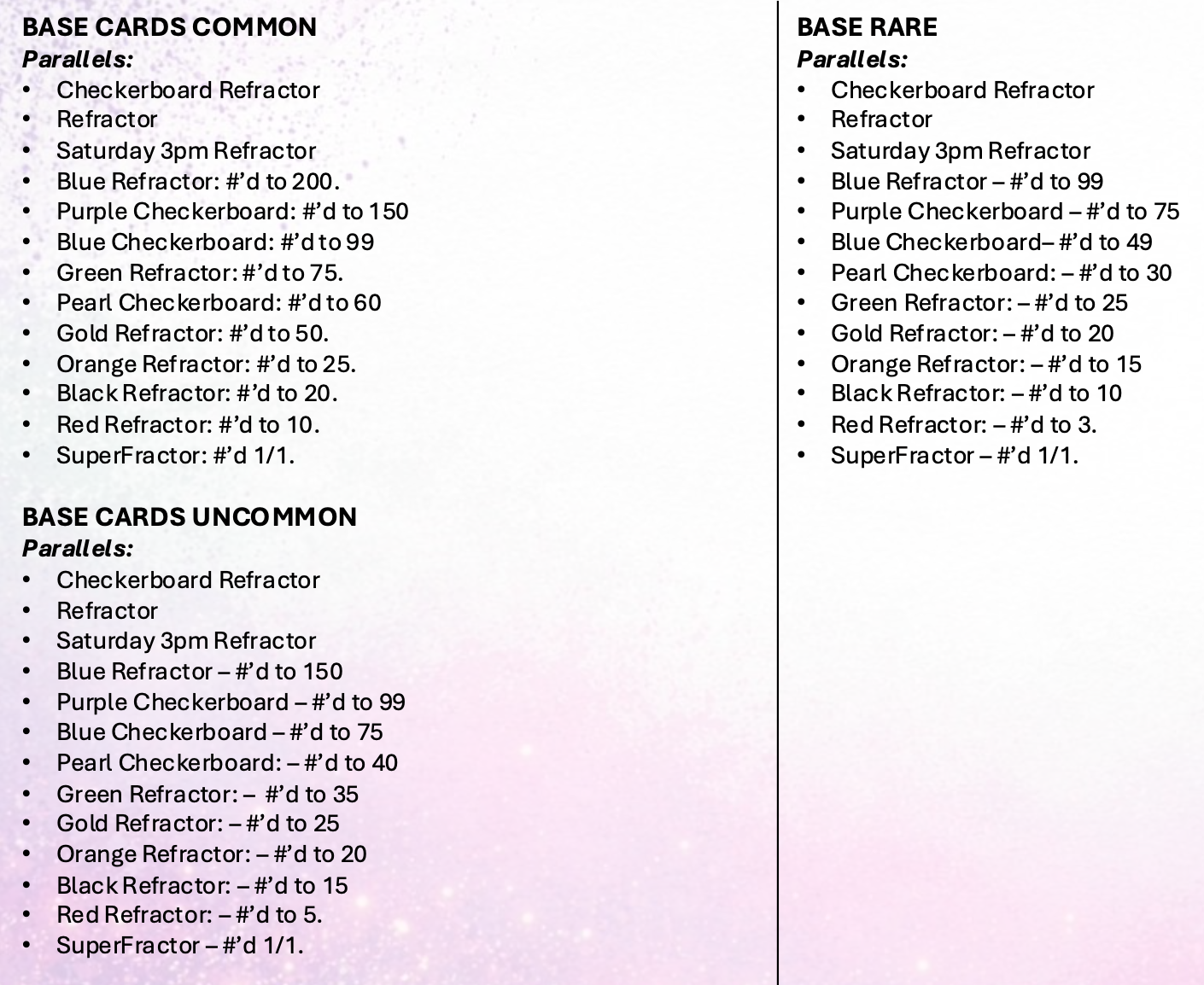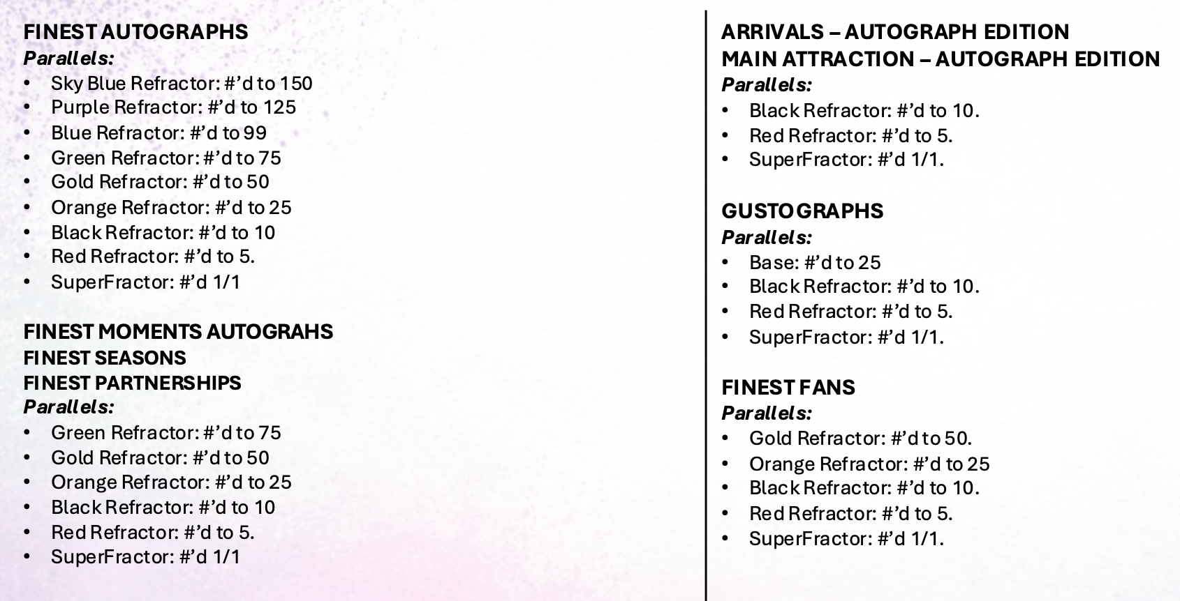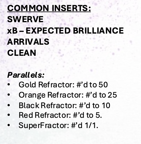 The Basics: There will be six 10-card packs per hobby box in this one with a tiered 300-card base set made up of Common, Uncommon and Rare cards. ... Every hobby pack will include two inserts, while a box will include six Uncommon, two Rare, 12 inserts as well as four to five serial-numbered parallels. A case will include one Finest Moments auto, one Swerve Fusion variation and one from the following sets -- Gusto, Nightmare Fuel, Main Attraction, Headliners, Aura or Polka. ... Inserts will include Swerve, Expected Brilliance, Arrivals and Clean. ... Full parallel breakdowns can be seen in the gallery below.