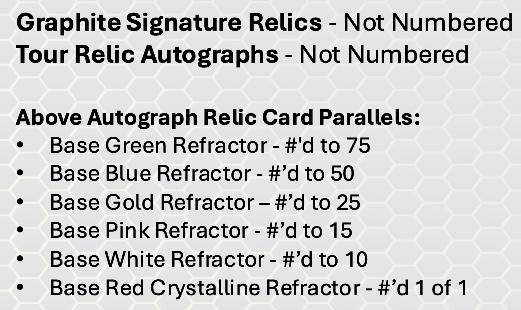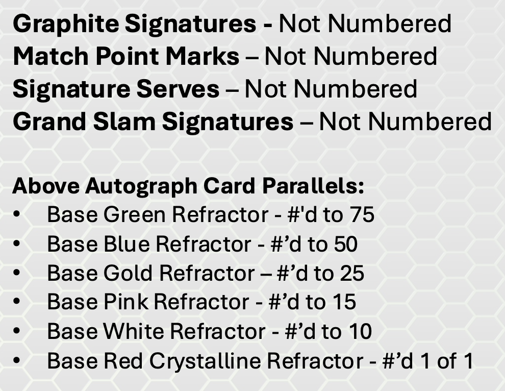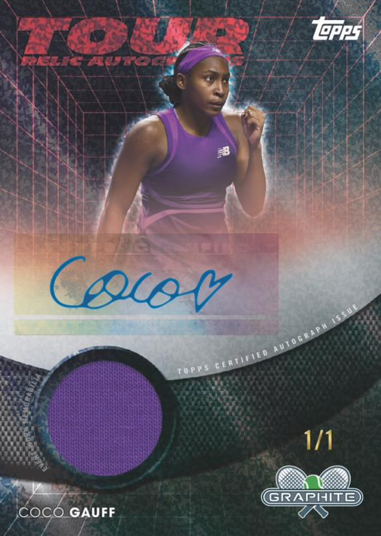 The Basics: Full details are still to come but it will be a 200-card base set. Inserts here will include All-Court, Court Masters, Match Masters, Break Point, Full Extension, Mirrored, Confetti and Intricate Images. Hits will include Graphite Signatures, Match Point Marks, Signature Serves, Grand Slam Signatures, Graphite Signature Relics, Tour Relic autos, Graphite Relics, Ace Relics and Rally Relics. ... Among the signers will be Andre Agassi, Boris Becker, Bjorn Borg, Billie Jean King, Chris Evert, Ivan Lendl, John McEnroe, Pete Sampras, Rafael Nadal, Steffi Graf, Andy Murray, Kim Clijsters, Michael Chang, Maria Sharapova, Naomi Osaka, Coco Gauff and Caroline Wozniacki for starters. ... Refractor parallels will include standard, Purple (/99), Gold (/25), Pink (/15) White (/10) and 1/1 Red Crystalline. ... Boxes opened at $259.99 via Topps.