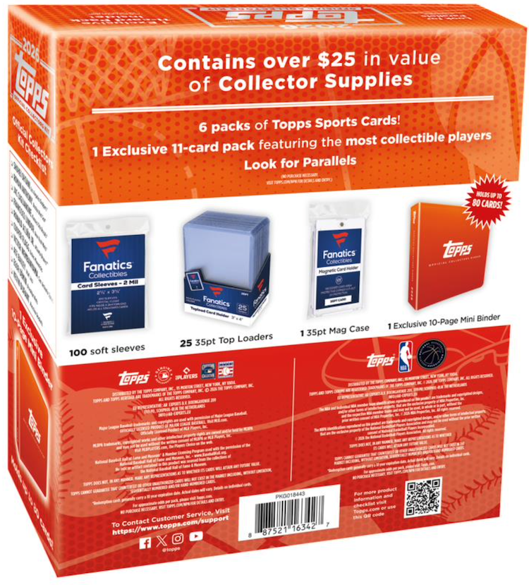 The Basics: There will be seven packs from 2026 Topps Series 1 MLB (two 14-card packs), 2026 Topps Heritage MLB (one eight-card pack), 2025-26 Topps NBA (two 14-card packs) and 2025–26 Topps Chrome NBA (one four-card pack) along with one exclusive 11-card pack (10 cards and one parallel) showcasing stars from both leagues. ... Also inside will be 100 card sleeves, 25 toploaders, a magnetic case and a 10-page mini binder "everything needed to protect and organize your collection from the start” per the company.