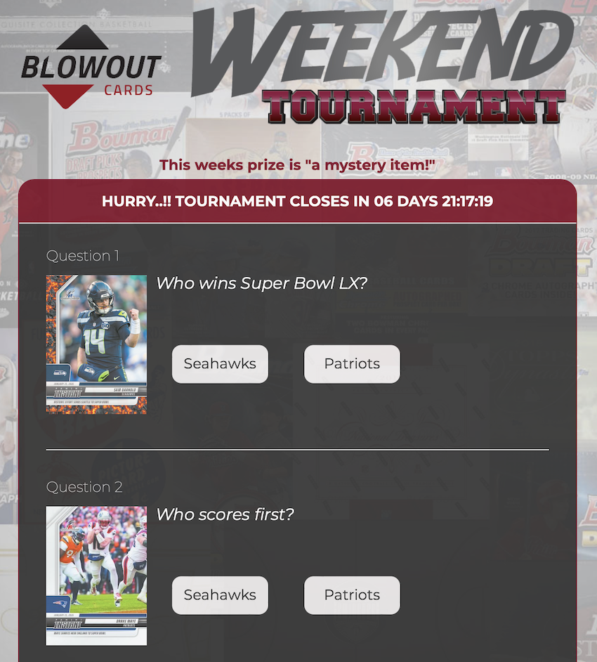 YourDozen.com is back with more free cardboard up for grabs to one lucky winner -- this time it's mostly Super Bowl picks but with a couple Majority Rules questions at the end. Those questions are simple -- whatever gets the most votes is the winning answer -- and we've sprinkled in those along with the traditional picks. The end result is still the same -- whomever has the most correct answers once the dust settles wins free cards.