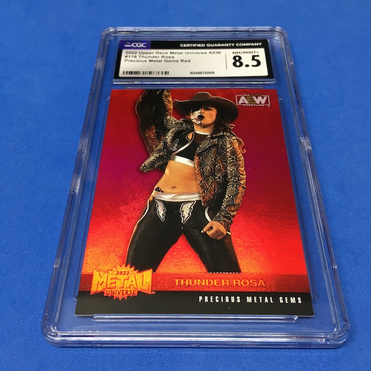The Reason Graded: Her three cards like this in Red and Purple have been on my grading radar and I have all three in Red to show for it in slabs ... but grading here is not easy with etched foil, those black edges and skinny stock. Despite that, I've still gone there for all but one in the six-card lineup. Why? I'm a fan of the Thunder, a self-made indy veteran who has had flashes of top-tier success in AEW.