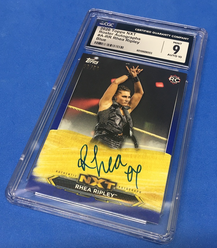 The Card: Rhea Ripley 2020 Topps WWE NXT Roster Autographs Blue parallel (/50) -- RC-year auto