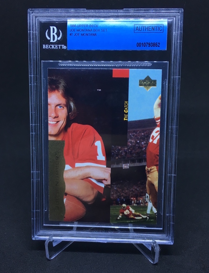 The Reason Graded: You don't see why? Ultimately I did want to see how this one might grade -- a zero on centering just seemed like it wouldn't be low enough, maybe a negative-10? I requested it be slabbed as authentic if not graded with a number and I'll admit that it bummed me a bit to not see this get a true grade. If you're wondering, this card is not alone -- I popped the lid to one of these sets back in the day when it was my bonus item in a repack bought at a Kmart and every single card was like this. I figured a card that shows part of an iconic play Montana is known for -- "The Catch" -- and a portrait was the best pairing for slab treatment, though there were others I could have chosen that showed him along with Jerry Rice (well, at least half of him). I have kept this miscut set all these years as it's truly an oddity in my collection.