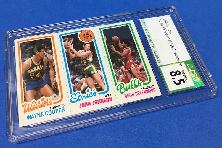 The Reason Bought: The center spot here is for the first NBA player I ever interviewed thanks to some school ties long ago ... so whenever a slab from his playing days presents itself without some dumb price tag attached I'll bite. This oddity of a set is, as you can see, one standard card perforated to be pulled apart to make three mini cards. It's not the only time it has happened, but it's quite a convoluted set that's home to a number of combos. There are sometimes the same card on different panels -- including Rookie Cards of Magic Johnson and Larry Bird both together and separate -- but I tend to just look and at a few names at times.