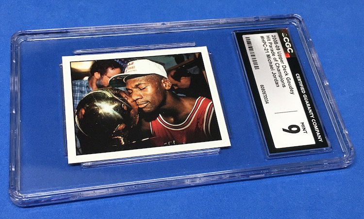 The Reason Graded: This moment turns 35 this year and this insert card is one that ... came out of a box of baseball cards. It's a throwback to a 1951 set with stars from a little bit of everywhere in this Goudey version. These cards are smaller -- allowing for them to bounce around inside the wrappers -- but the only even close to deterring issue for grading with this copy was an irregular spot in the card stock itself ... but you can't even see it in this image. This finally made it into a grading submission of mine last year because it's an iconic moment for one of biggest names in sports history. The moment? This was Jordan's first championship.