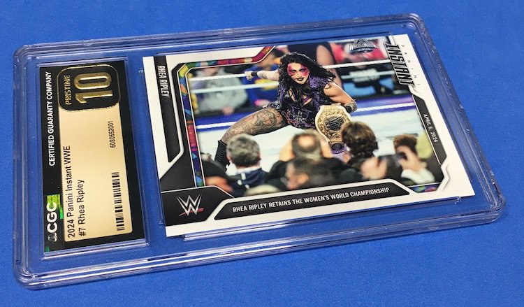 The Reason Graded: Just like my other Ripley this month, this too has an error* on the label where the parallel (the stripe is colored) fell off my submitted info and didn't make it onto the card. Only five copies of this exist and I grabbed it direct from Panini on drop day. I finally worked it into a sub last year to help add things into my registry ... but, alas, the error. (Registry is about the only place it really matters ... if I also had slabbed a regular version. But, I don't even have one of those.) This shows her entrance to 'Mania with her distinct makeup for the big day -- a different look from what we saw earlier.