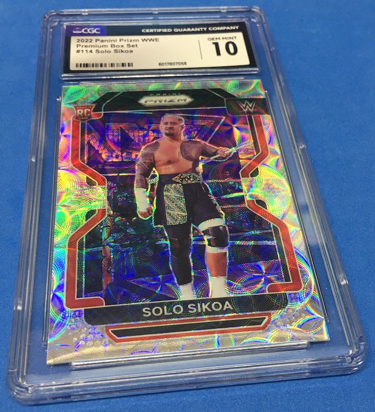 The Reason Graded: Early on, this newcomer's presence at the top level of WWE was a strong one -- he was the silent muscle for The Bloodline -- champ Roman Reigns' group -- and for its interactions with The Rock and with Cody Rhodes in the recent past. But as stories have evolved away from that time -- that's back when I finally opted to slab this one as I like this set parallel's look -- in more recent times, I have softened on my interest here. Because of that, this card sat, despite my landing a good grade. Will new developments bring Sikoa back around to where I'd like to see? Maybe ... it certainly can't hurt to have him doing more and him having a championship after this past weekend.