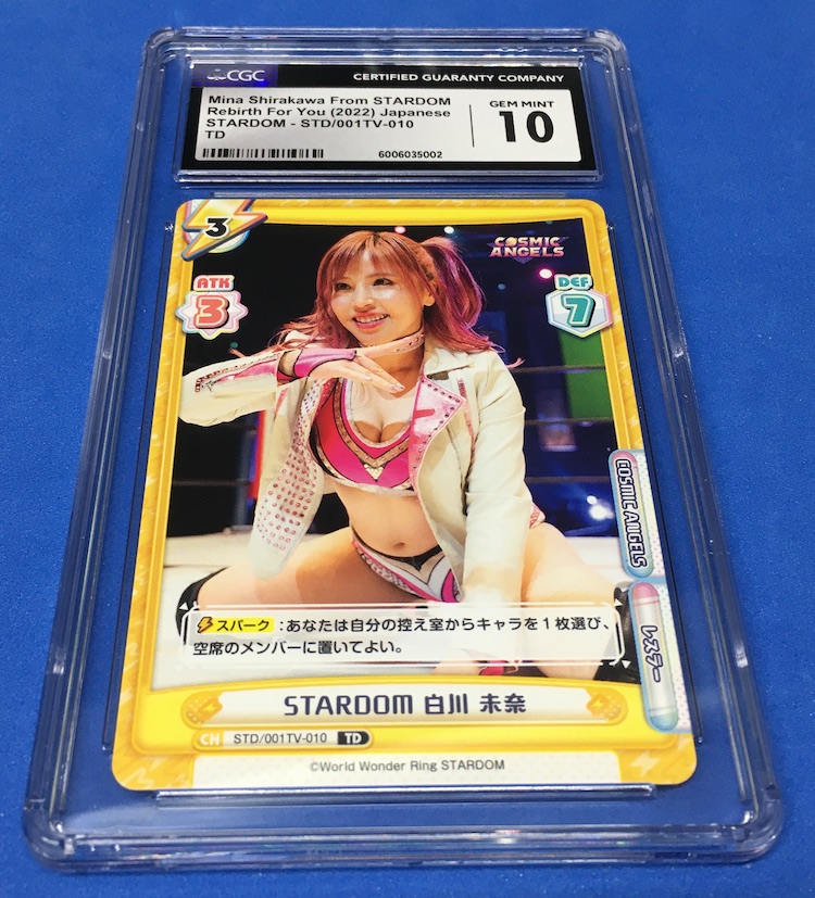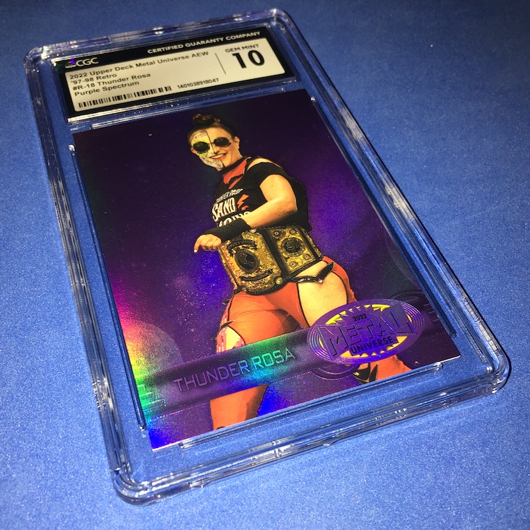 The Reason Graded: This Japanese wrestling veteran recently arrived in AEW and Ring of Honor for some high-profile TV time on a full-time basis and that has gotten me to bite on a select few of her earlier cards as the American cardboard is still slowly but surely on the way. This one comes from an oddball gaming-style brand -- it's one that showcases all kinds of properties, not just this wrestling company -- and it's a line where the cards are remarkably clean. I'd be shocked to not land a 10 on these cards a majority of the time.