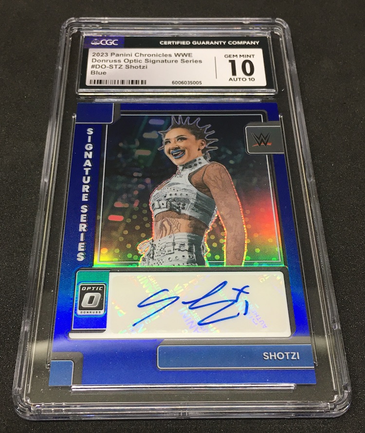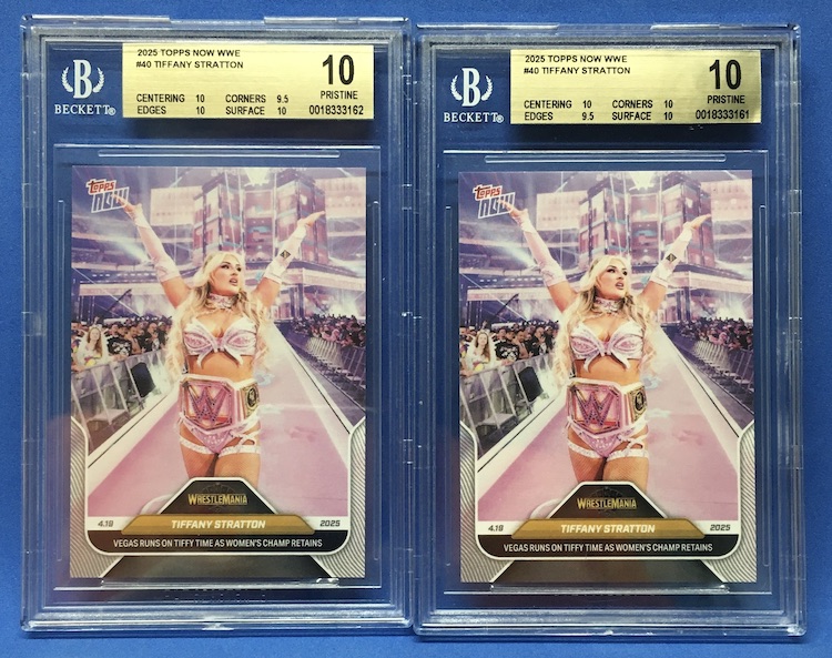The Reason Bought: This is another Now card that has been slabbed in high volume in at least a couple of submissions -- long runs of consecutive serial numbers -- and they have recently also popped up on a Fanatics-adjacent site's eBay page. So, knowing that WWE Shop and related places are perhaps likely to have slabbed copies at some point, I'm probably slowing to a halt on my own raw-lot buying for Now cards. (I had been sticking to a name or two, but copies I received in a recent batch were not clean enough for my taste -- see it in the Buzz Buys archives.) In this case, I picked off this already-graded pair at an average price of about $20 apiece, which I was fine with for 10s -- though prices got really, really, really soft here for all marks from the initial eBay seller.