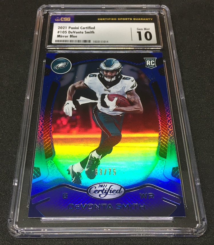 The Card: DeVonta Smith 2021 Panini Certified Mirror Blue (/75) -- Rookie Card parallel