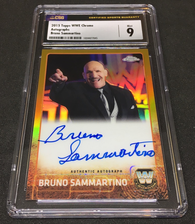 The Card: Bruno Sammartino 2015 Topps Chrome WWE Gold Refractor Autographs (/10)