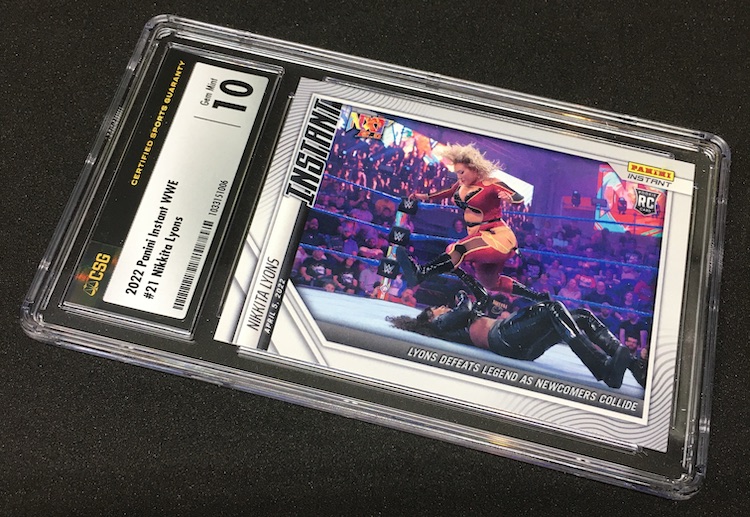 Reality Check: I was happy with the grade since it's a debut card for sure but she's also been out of action so long that even that doesn't matter all that much here ... she has a decent amount of stuff to find now that WWE cards are in Year 2 for Panini and she's in there. I was surprised to see five graded and most checking in at this mark. The stock and centering on Instant stuff isn't as clean as I think it should be ... I've seen and received some rough stuff if you have grading in mind.