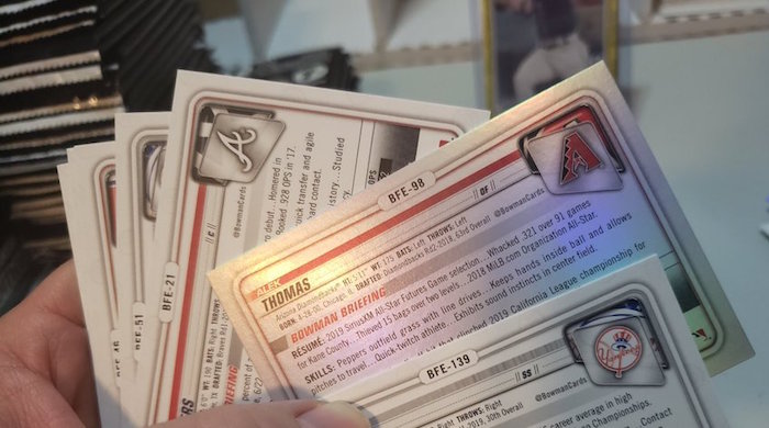The unusual conditions that led to this one -- Topps' primary printing location was closed with the standard Bowman cardboard left playing the waiting game -- also led to a non-traditional release format for the 1st Edition created elsewhere. This release was initially offered via Topps.com by the pack -- limit 24 packs (one box) -- and sold out quickly over the span of its three initial public offerings. A portion of the print run also was allocated to a number of Topps dealers, too, to help their businesses in this unusual and challenging time. (That said, we're buying these boxes as it's firmly on the Blowout's Most Wanted list -- keep reading.)