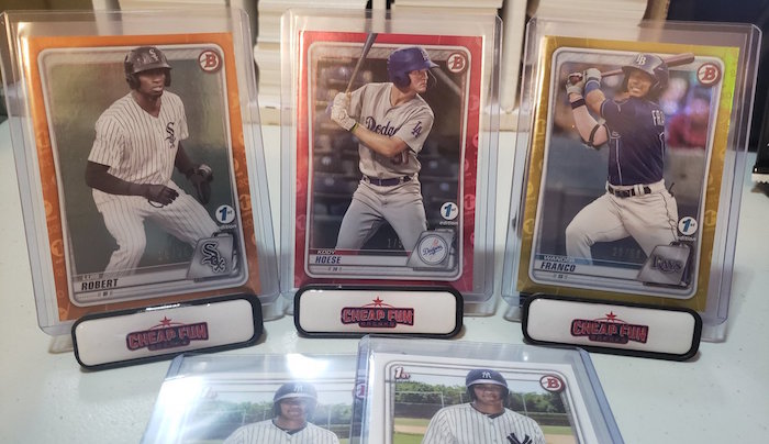 Dominguez's base cards have sold for as much as $288 on eBay with consistent sales at $200 a pop right now. Asking prices in active auctions? They're actually higher right now -- and we haven't even seen multiple copies of all of the various parallel versions to be found in this release. His cards have Sky Blue (every other pack), Blue (/150), Yellow (/75), Gold (/50), Orange (/25), Red (/5) and 1/1 Platinum parallels -- and there's also likely an autographed version to be found. None have hit eBay yet, but you can see a sampling of Dominguez's color -- and other cards -- pulled on Night 1 of 2020 Bowman 1st Edition via BlowoutTV with Houdini in the gallery below.