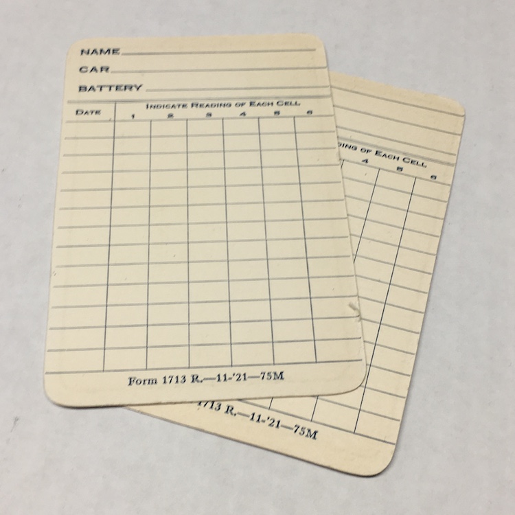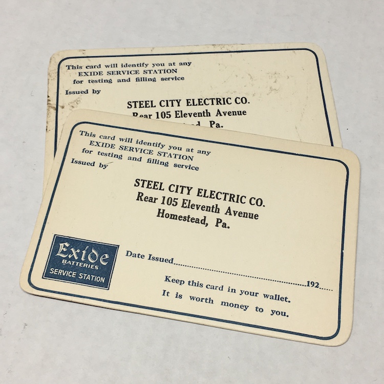 Sixth ... A pair of 1921 Exide Batteries Service Station maintenance cards (I think) for Steel City Electric Company in Homestead, Pa. (They may have been stuck together, giving me a bonus item. ... also, the typical price of these on eBay is around $20?)