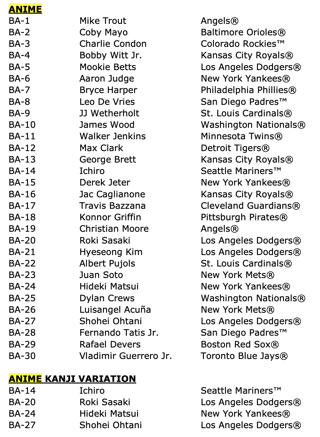 Buzz was busy today adding a bunch of cardboard to the preview gallery for the forthcoming 2025 Bowman release (click here to see all of those and order your boxes), but this one -- all 30 cards in the 2025 Bowman Anime insert set -- gets its own standalone.