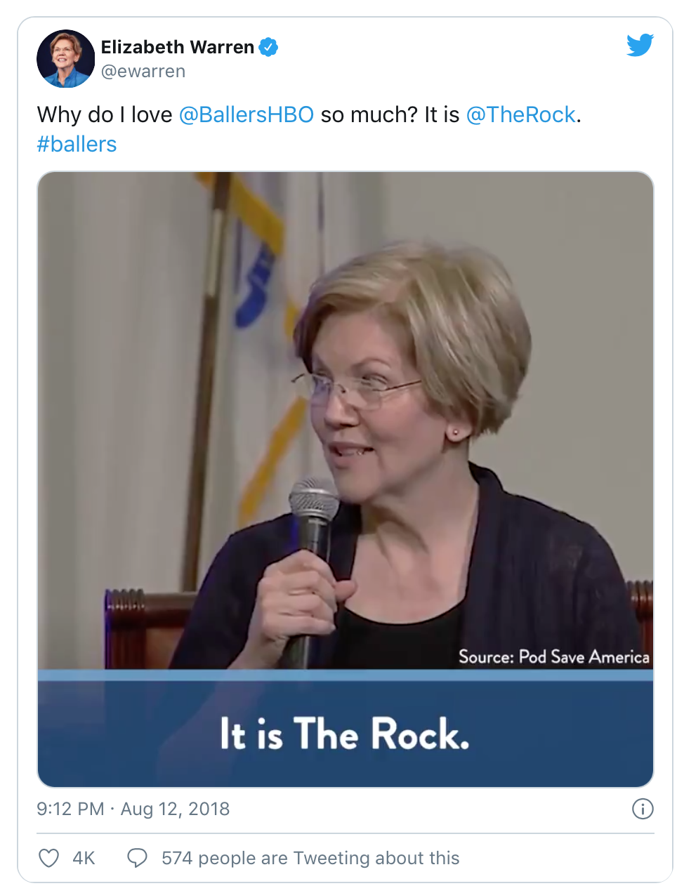If you google "Elizabeth Warren Ballers" a mere 815,000 items pop up. I'm sure some of that is SEO filler about two Internet heavyweights, but there are more than a few mentions of Warren and the show. A you can see at right, she tweeted at him before the season debut, and that wasn't the only banter, either. (Other tweets are in a gallery below and some made for entire stories out there for entertainment writers.) While exploring this whole subject, Entertainment Weekly asked Warren about the book's on-screen moment.