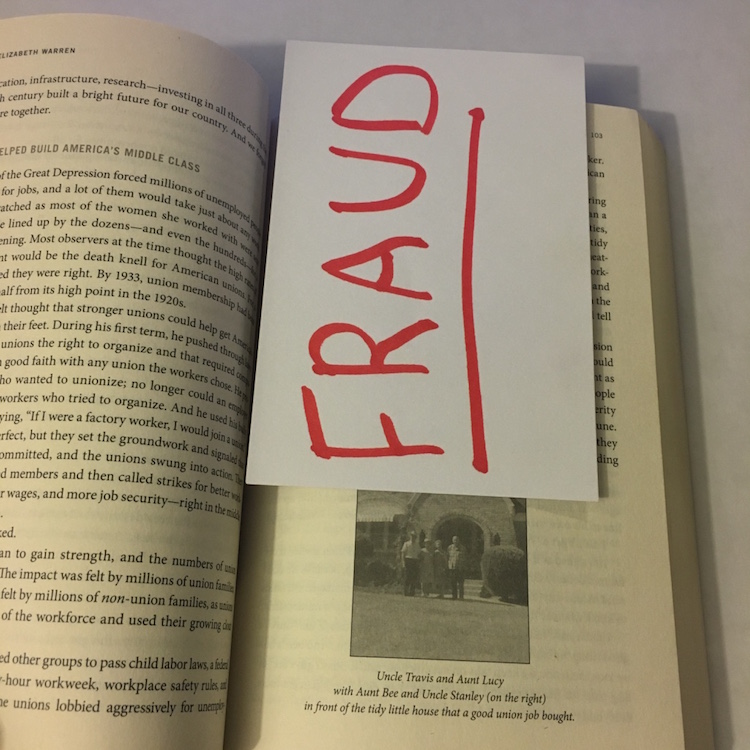 Flipping through my book revealed no secret signatures from either Warren or Johnson -- after all it was a prop and she didn't know about it -- but I did find a surprise inside that wasn't seen on screen and adds some mystery. Perhaps it's some bookmark reminder of the mindset Johnson needed to use during the discussion -- the episode later reveals why he lied to her about not going into the ocean -- or maybe it's from an unused part of the scene, something that Strasmore worried to be true at that point in his life. I don't know. What was it? A 3-by-5 card with the word "FRAUD" boldly written in red-marker all-caps. It was tucked between pages 102 and 103 above a photo of Uncle Travis and Aunt Lucy. (They are 100-percent real.)