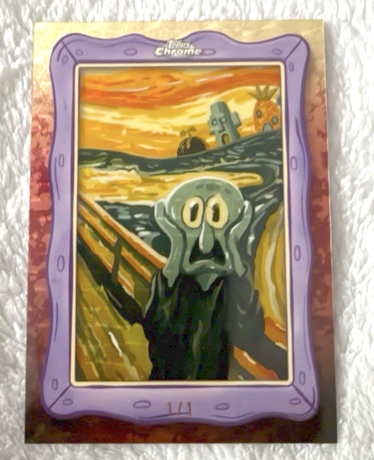 The big sale so far is this triple-auto card with ink from three voice actors who bring the beloved TV icons to life -- Tom Kenny, Bill Fagerbakke and Rodger Bumpass -- who are SpongeBob, Patrick Star and Squidward. It was a $50K sale 10 days ago. A second multi-auto Super sold just today, according to eBay. That one with just two of them (no SpongeBob) and it went for somewhere north of $20K as it is listed above a $20K purchase of a SpongeBob homage to the iconic 1893 piece by Norwegian artist Edvard Munch called "The Scream."