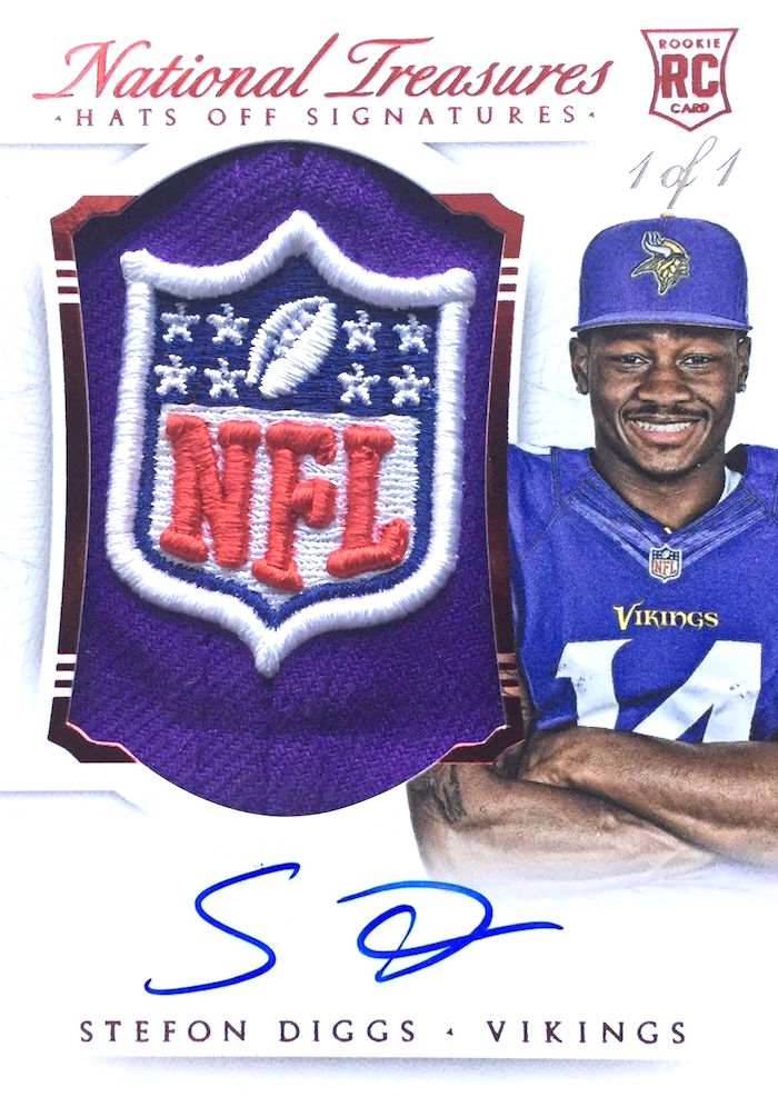 -- Stefon Diggs This Vikings WR didn't have the most catches or the most yards on Sunday but nine for 128 and a pair of touchdowns in a 29-29 tie with the Packers is one that's of note. What's even more of note? He didn't lead his team in catches for yards, either, as that was Adam Thielen but he only scored once. All of these things should make you take note of Kirk Cousins' arrival and keep all of them on your mental radar. Diggs' Rookie Cards are in 2015 boxes and might be the best bargains of the bunch as he's got three TD catches this season but had just eight all of last year.