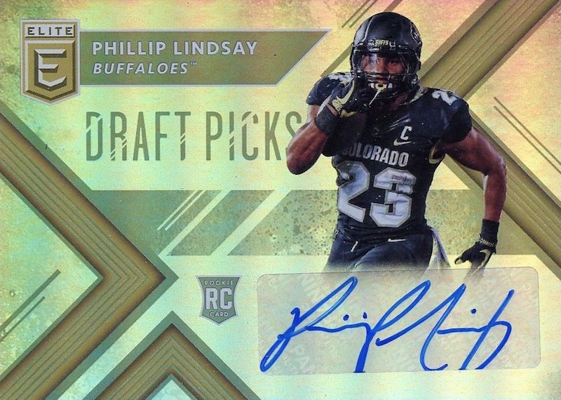 -- Phillip Lindsay The Denver Broncos have a history of pulling RBs out of nowhere but in the case of their latest 100-yard back he came from their backyard. This former University of Colorado star (with hair that could draw in fans alone) had 14 carries for 107 yards on Sunday. He hasn't scored a TD yet this season but he's got 29 carries for 178 yards in a pair of wins. Not bad for an un-drafted rookie who has just 29 cards -- all autographs -- found only in Panini America's Elite Draft and Contenders Draft Picks as well as three cards in Leaf Draft.