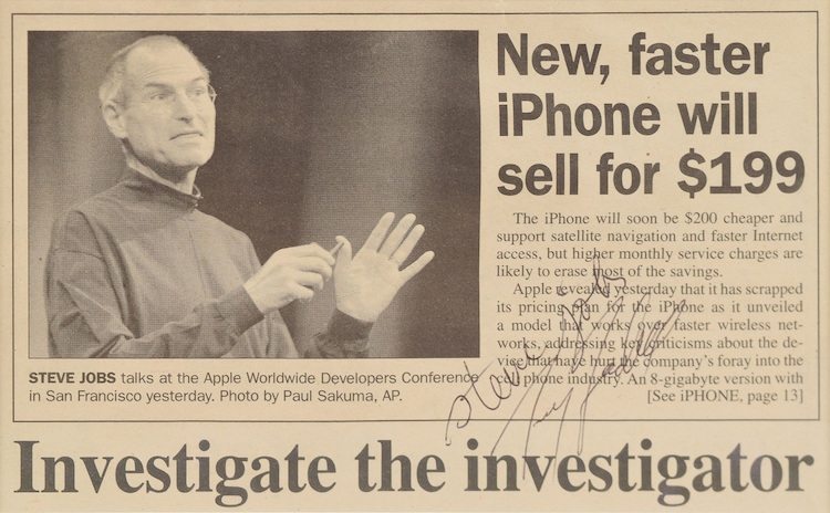 Boston-based RR Auction has three signed Jobs items in its next auction with the signed Mac OS X manual above the cheapest of the three with an opening bid of $1,000. Also up for grabs is a signed newspaper clipping relating to an iPhone release at $2,500 and a job application from 1973 that opens at $5,000 with a super-clean and small signature.