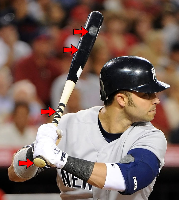 This zoomed-in crop of a publicly available Getty Images preview photo taken by Lisa Blumenfeld shows four spots of wear that can all be seen on this Nick Swisher game-used SSK bat from 2012 that Buzz owns today.
