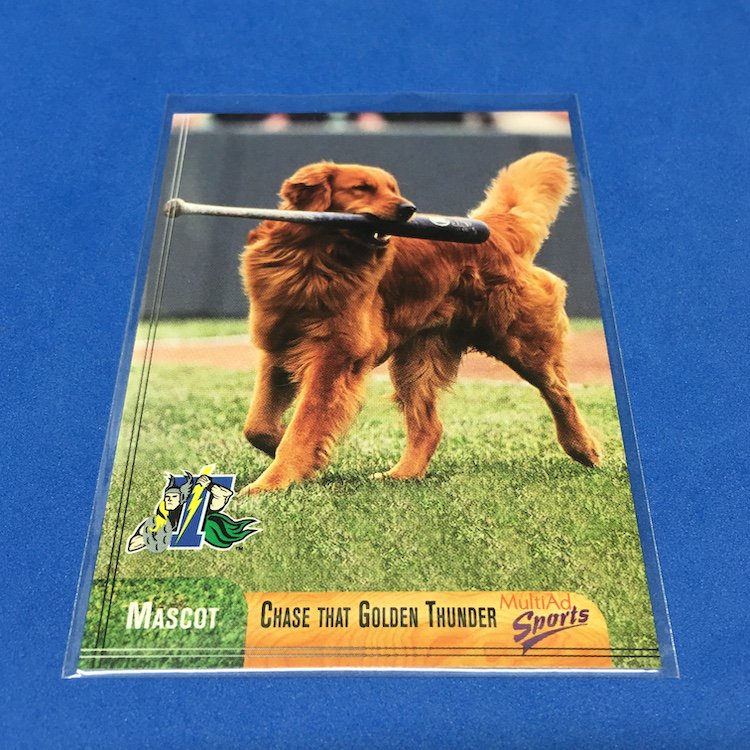 The Buzz On This: There are more than a few diamond dogs out there when it comes to MiLB and on MiLB cardboard, too, and I figured we’d lead off a new season here with a throwback to a legend on the field who made his debut back in 2002. What’s a batdog? His job was picking up bats with his mouth, taking water bottles to the umpires and amusing fans during games. Chase was the O.G. batdog for the team and had at least three successors after his death in 2013. These pups are merch machines and, of course, they appear in baseball card sets made through the years. This is just one of those you could collect.Keep reading for more examples of some weird or fun baseball cards you can find in and around MiLB.