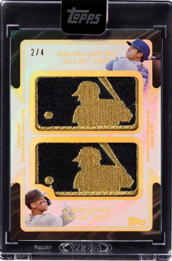 Why it’s Buzz-worthy: This monster card came out of a pack in recent months -- well, at least its redemption did -- and it's already on the auction block for a cash-in. What is it? It's a card with the gold-threaded MLB logo patch off of game-used jerseys from the reigning MVPs from each league in 2024 as worn last year -- if you look closely at both images on the card you can see them, too. (Enhanced to make sure they stand out more? Not necessarily ... but they sure do pop on those tiny images.) Cards like these -- signed and unsigned as singles and immensely rare finds -- are some of the biggest pulls in the heavily produced brand with long odds. The back of the card has built-in windows for you to see the MLB Authentication stickers for these patches pulled from their jerseys (click to view and go look them up for yourself). Should these be a hold or moved immediately? I bet your answers are all over the place -- but the longer one waits, the more the chances other cards like this might be done over time, giving them more competition if they are all up for grabs at the same time. Ohtani and Judge are two of the game's biggest names of the here and now and figure to be later. How big among the all-timers? We'll find out when they are done ... but they are as safe as it gets right now, too.Keep reading for more interesting pieces up for grabs right now.