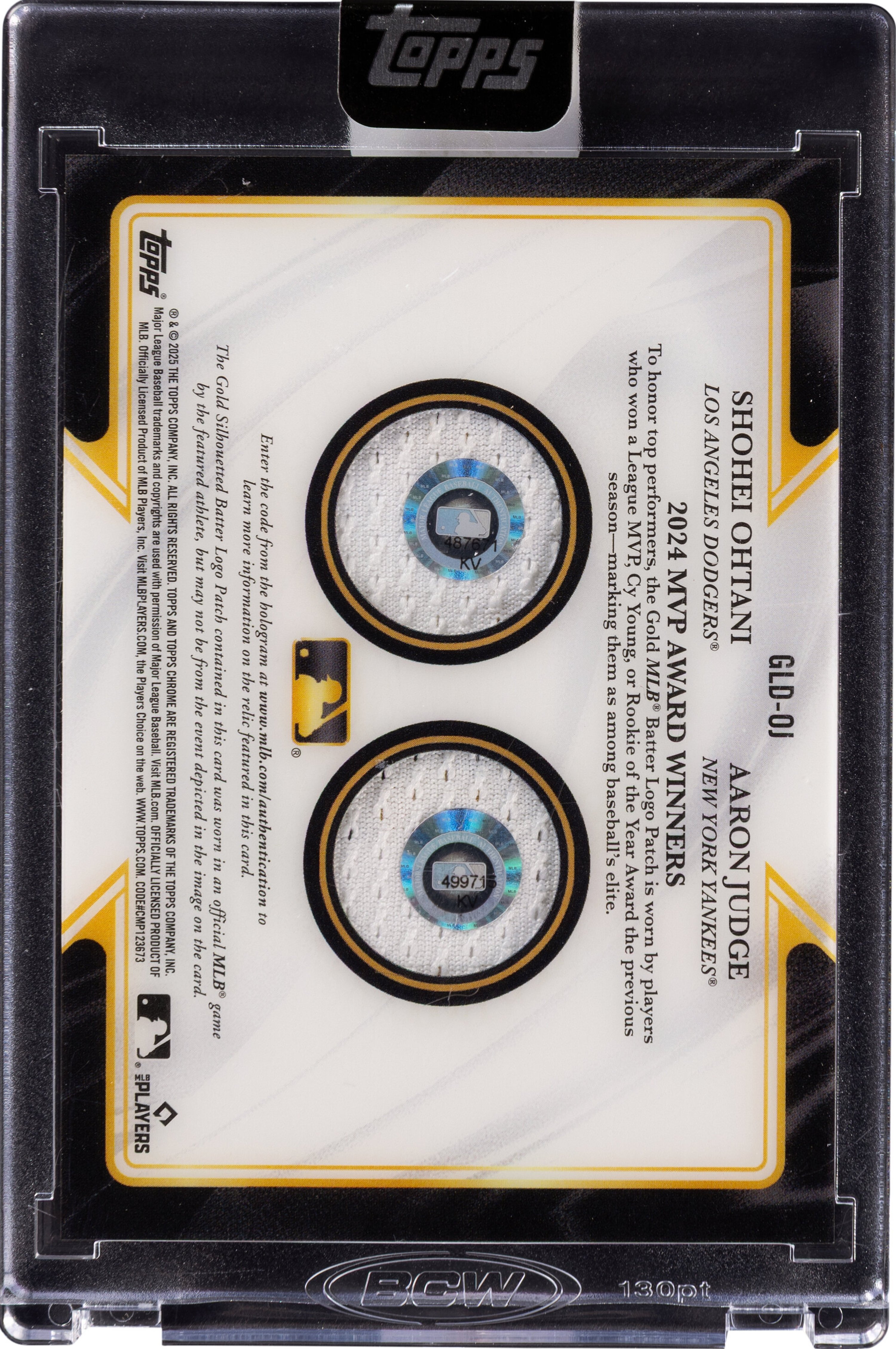 The Item: Shohei Ohtani & Aaron Judge 2025 Topps Chrome Update Dual Gold Logoman MVP Relic (/4)