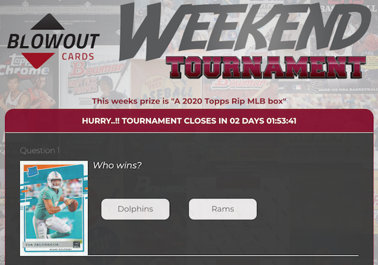 It's solely predictions of who will win 12 NFL games with Tua Tagovailoa's first-start stats the tiebreaker. This week's prize is a 2020 Topps Rip MLB box.